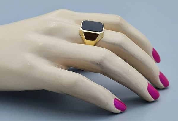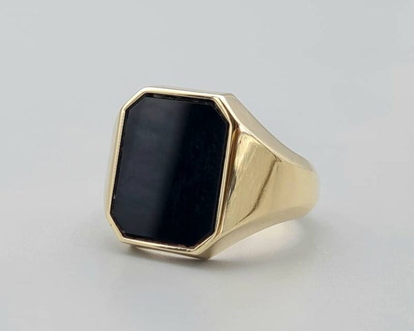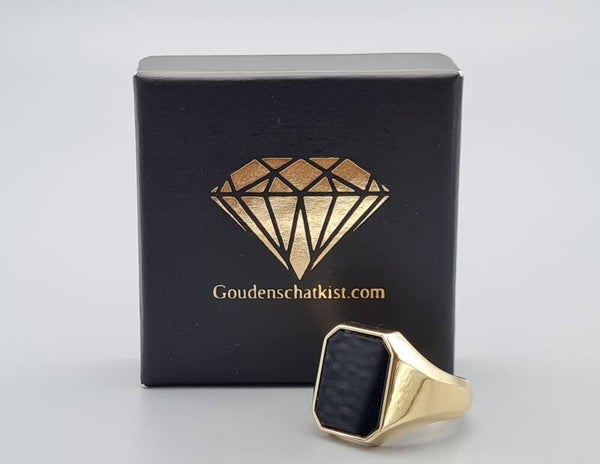 Exclusief gouden zegelring gezet met een onyx. De git zwarte steen is geslepen in een rechthoek met schuine hoeken. De ring heeft een volledige gladde afwerking. Dit prachtige heren sieraad is vervaardigd uit 14 karaat geelgoud (585/1000).