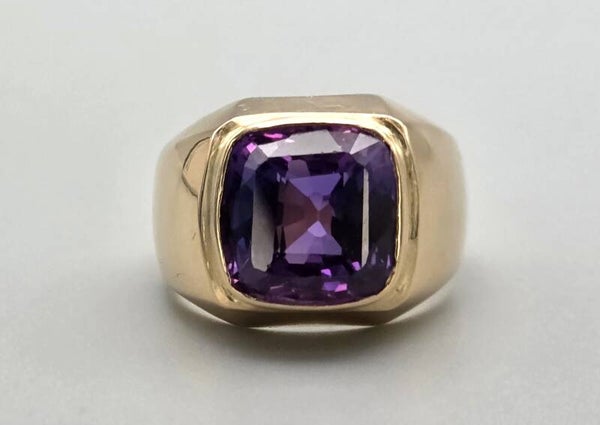 Deze ring heeft door de prachtige paarse kleur van de amethist een hele frisse uitstraling. Daar word je toch blij van?! Dit vintage gouden sieraad is gemaakt van 18 karaat goud. Kan voor heren en dames
