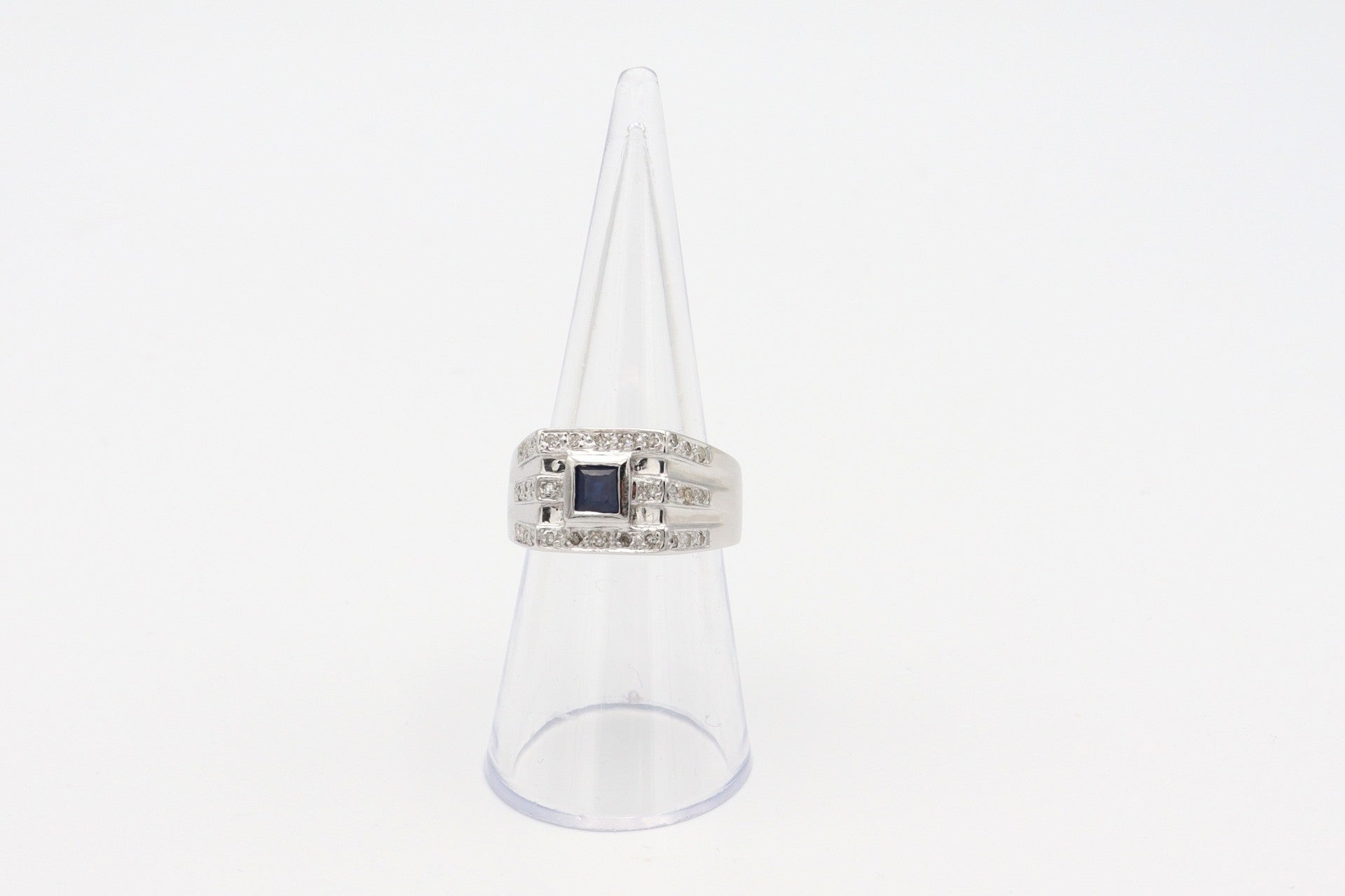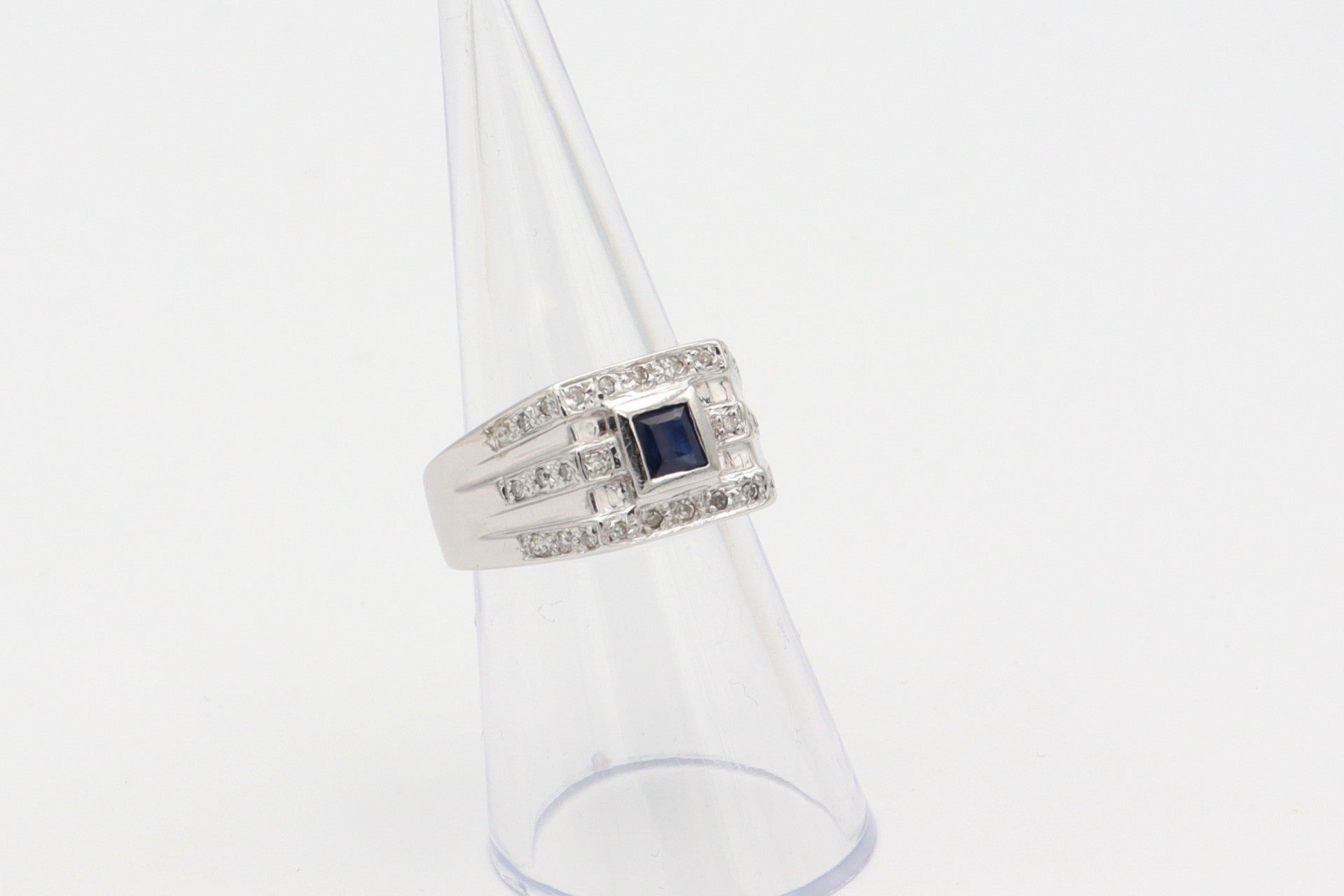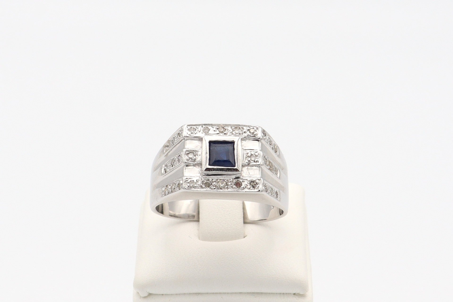 Wit gouden vintage ring met blauw en witte saffier. Maat: 17.5. 2020/102.