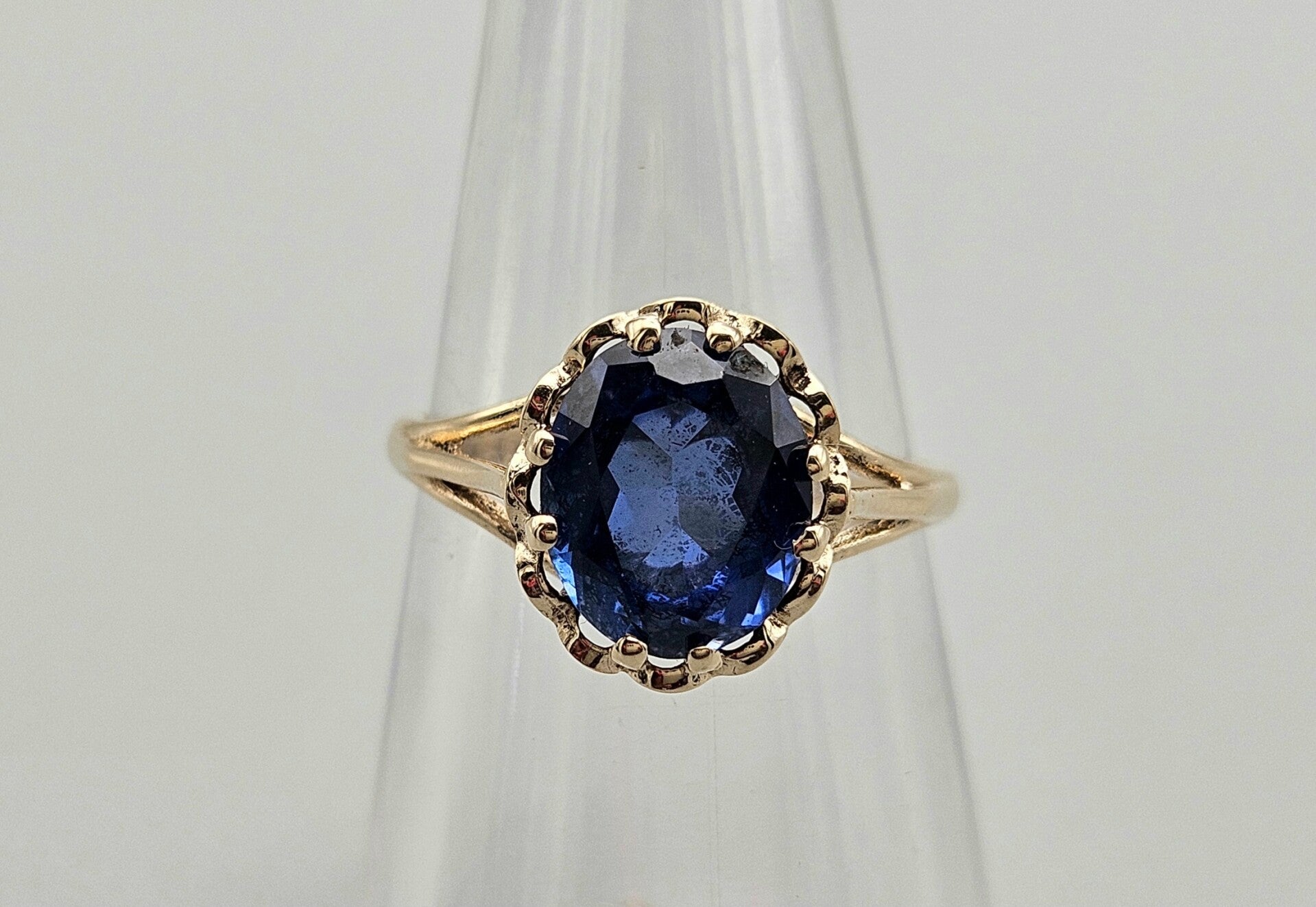 Deze prachtige opvallende vintage ring is gemaakt van 9 karaat goud. De ring is gezet met een ovaal geslepen natuurlijke blauwe saffier.