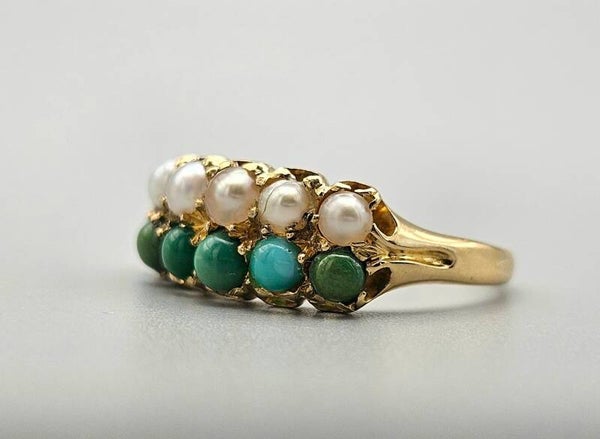 De ring is gezet met parels, en Cabochon geslepen Turkooise.