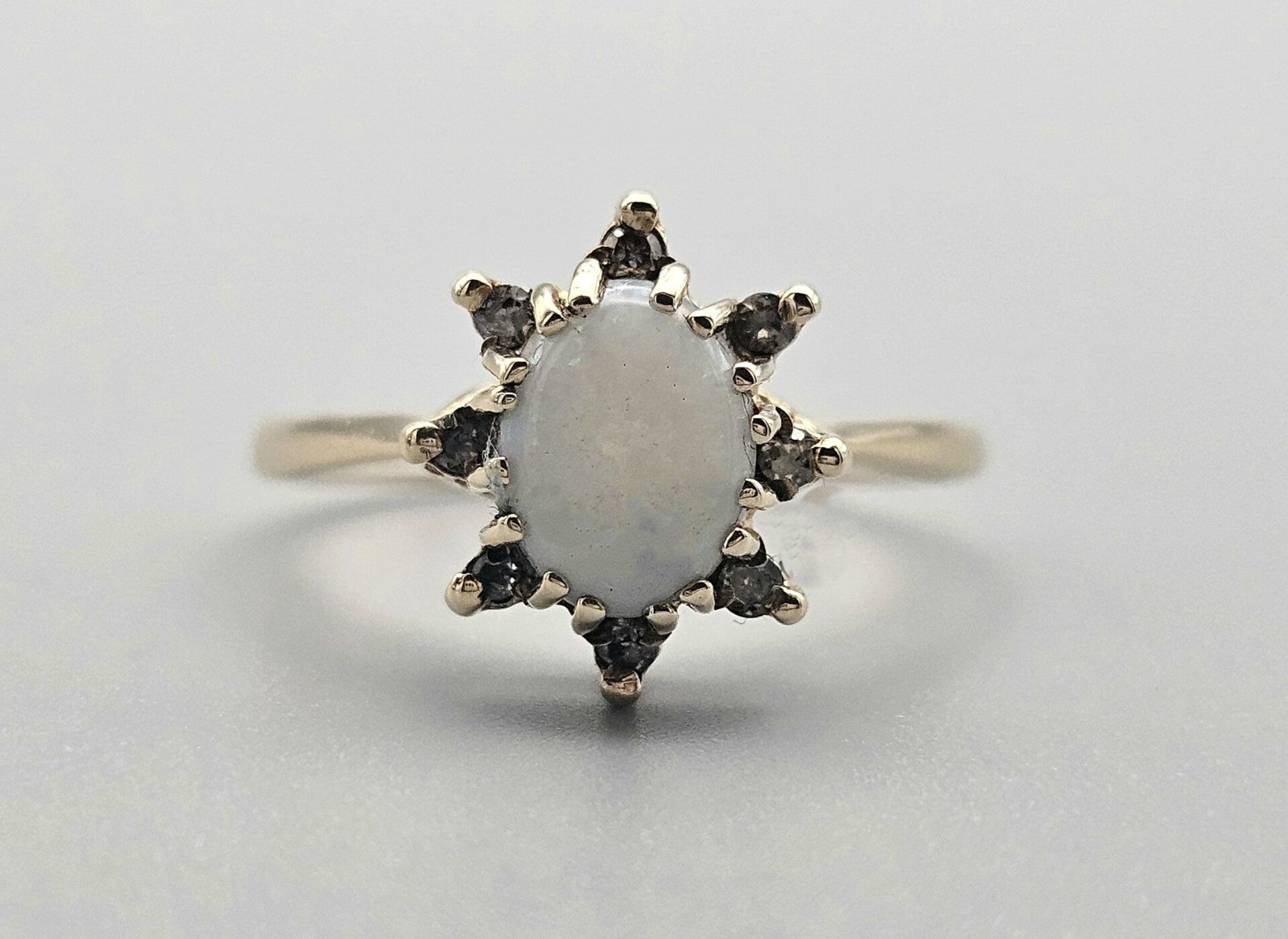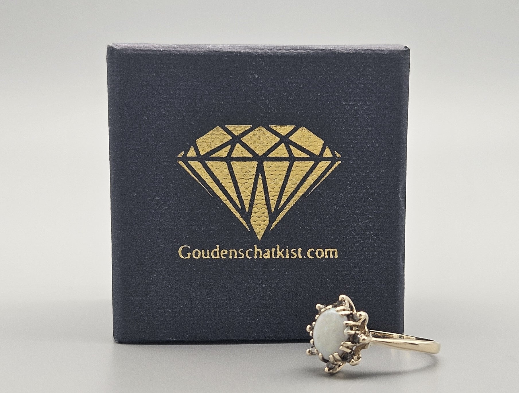 Deze prachtige vintage dames ring is gemaakt van 9 karaat. De kop is bezet met prachtige opaal en briljant geslepen diamanten.