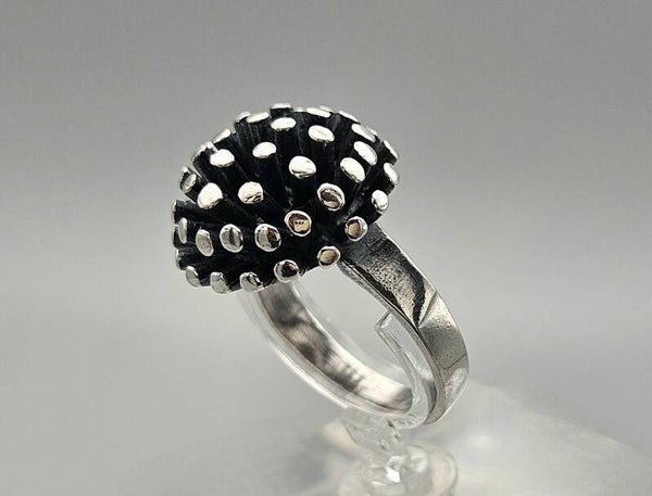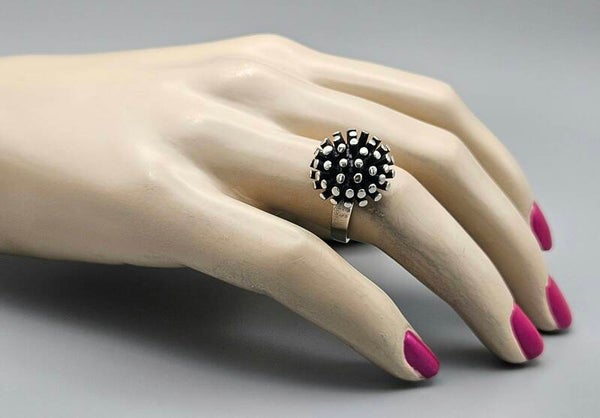 Een absolute eye-catcher en zeer exclusief exemplaar! De handgemaakte zilveren timeless ring is gemaakt van 925 zilver. De ring is verfraaid met een verfijnde bolletjes. Door de bolletjes ontstaat er een unieke schittering. Deze ring maakt indruk!