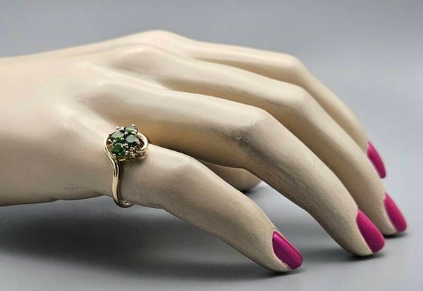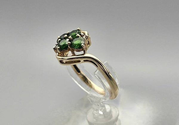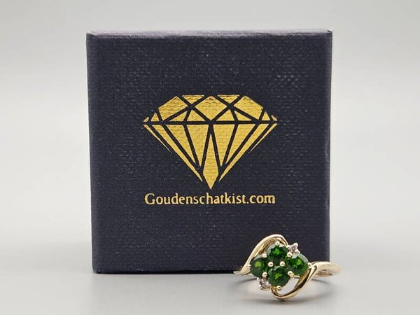 Deze unieke mooie vintage ring is gemaakt van 9 karaat geelgoud. De ring is gezet met diamanten en prachtige smaragd edelstenen. De smaragd zijn briljant geslepen en valen mooi op. De diamanten zijn briljant geslepen. Kan ook mooi als verlovingsring gebruikt worden.