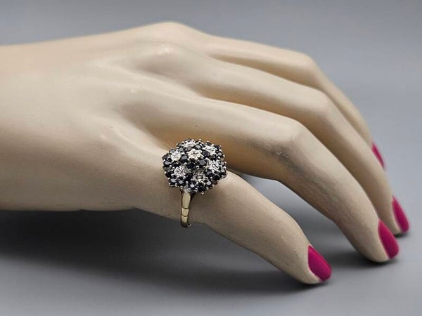 Vintage ring gezet met saffieren en schitterende diamanten. Een prachtige combinatie van edelstenen in een prachtige ring. Deze opvallende en luxe dames ring is vervaardigd uit 9 karaat.