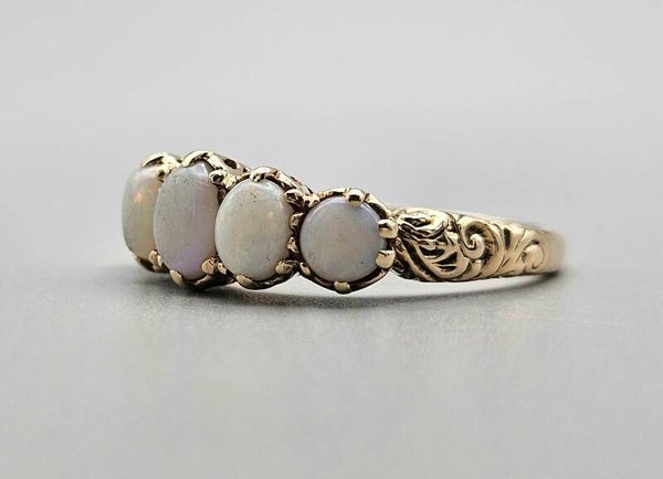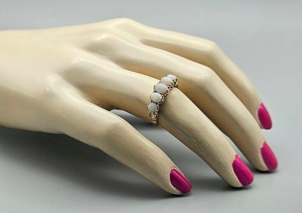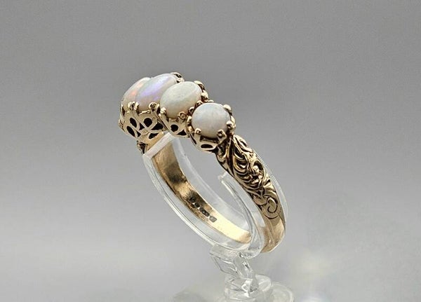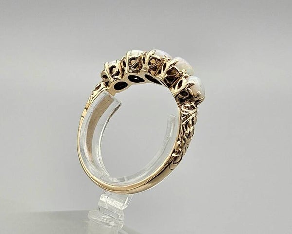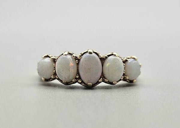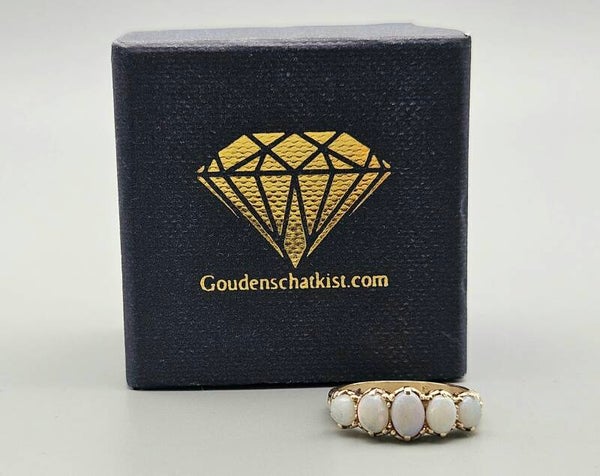 Deze vintage gouden dames ring is gemaakt van 9 karaat geelgoud. De ring heeft een unieke vorm, met 5 opalen is bezet. Wanneer het zonlicht hierop schijnt, komen er prachtige kleuren tevoorschijn.