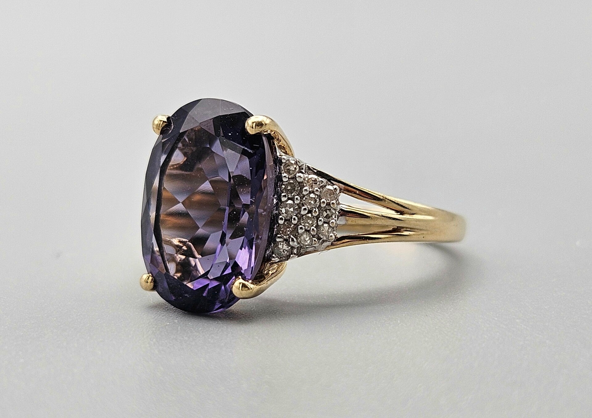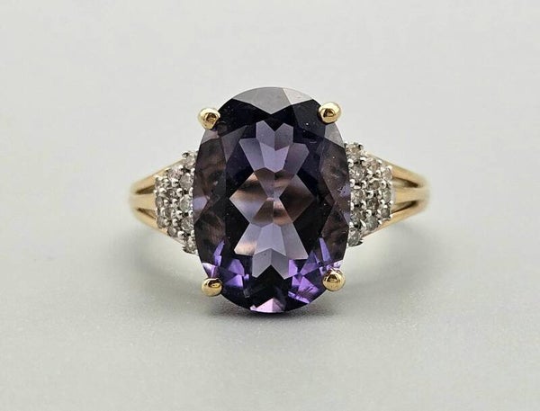 Deze mooie vintage ring is gemaakt van 9 karaat geelgoud. De ring is gezet met diamanten en prachtige paarse edelsteen alexandriet. De alexandriet is facet geslepen. De 24x diamanten zijn briljant geslepen.