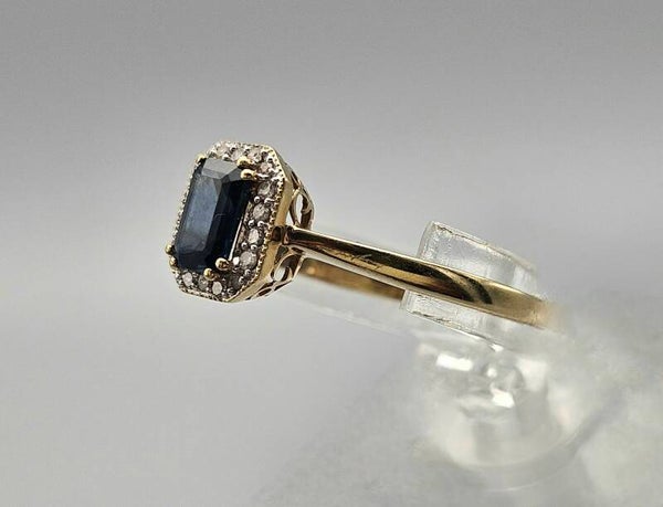 Deze vintage ring is gemaakt van 9 karaat. De ring is gezet met diamanten en prachtige donker blauwe edelsteen saffier. De saffier is facet geslepen. De 18x diamanten zijn briljant geslepen.