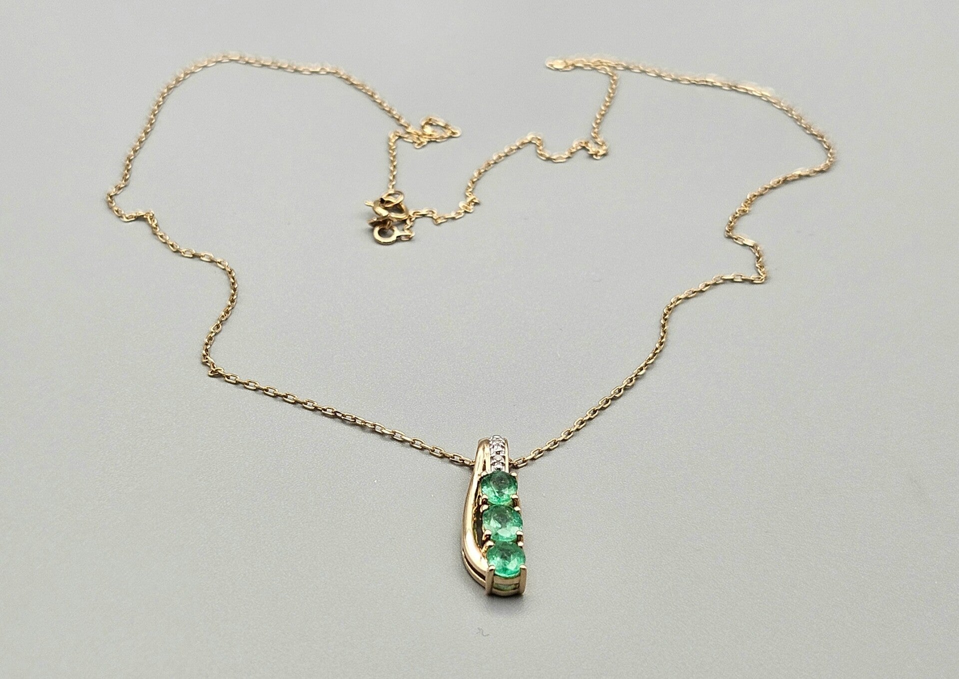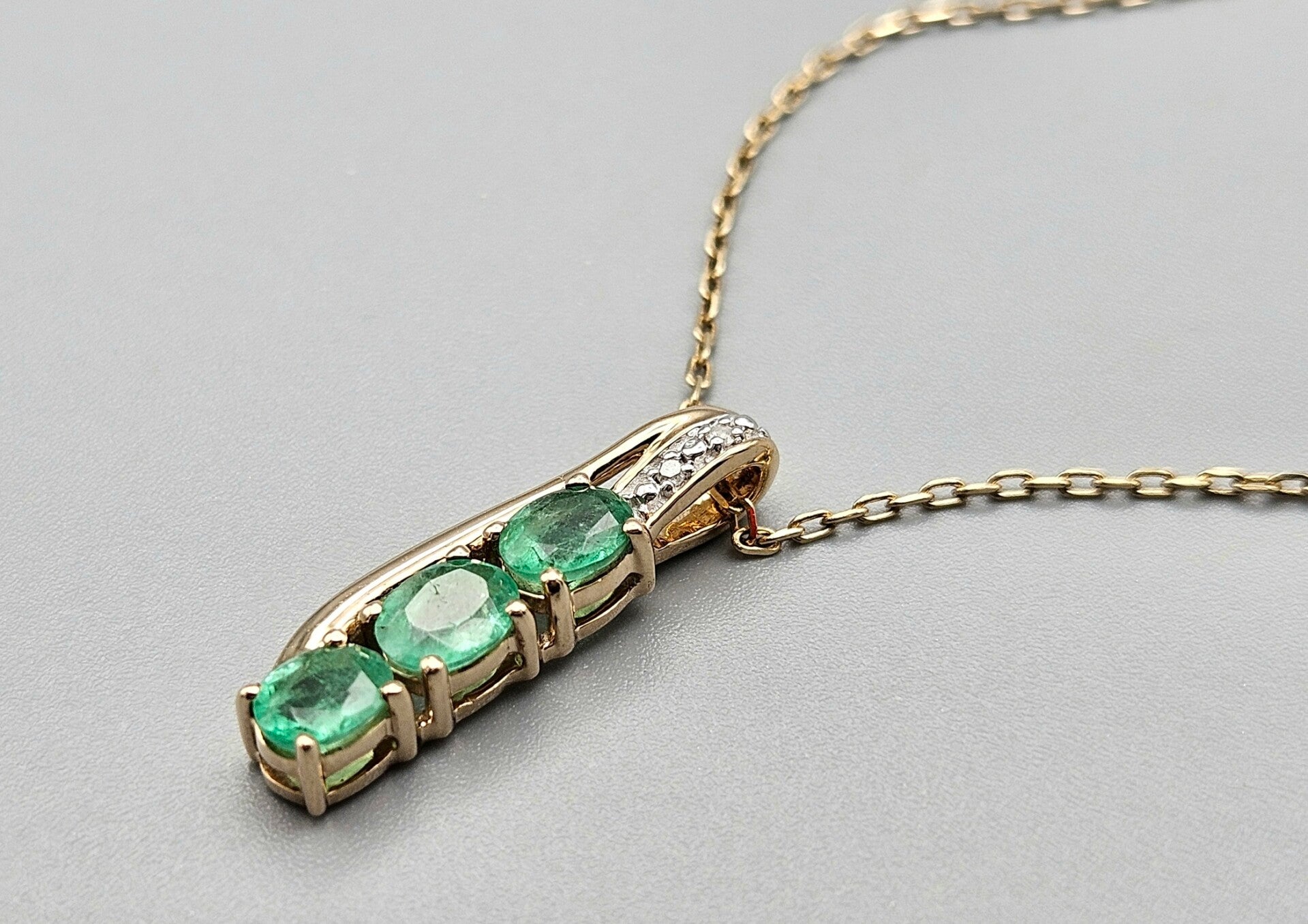 Deze dames ketting is gemaakt van 9 karaat geelgoud en heeft een hanger. De hanger is gezet met een briljant geslepen diamanten en facet geslepen smaragden. De diamanten hebben samen een gewicht van 0.02 ct.