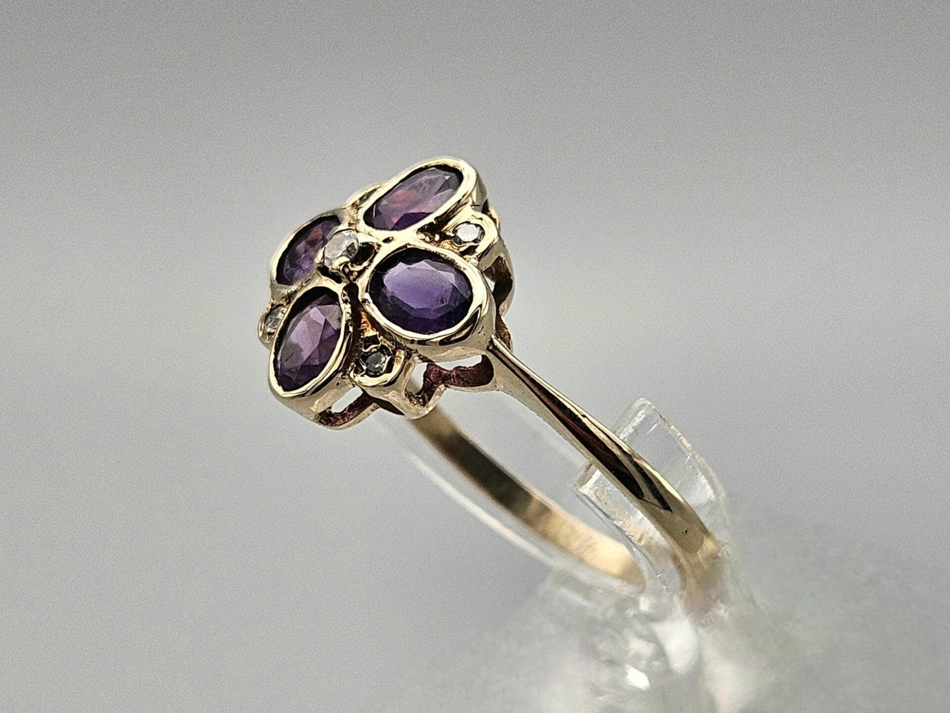 Deze schitterende mooie vintage ring is gemaakt van 9 karaat geelgoud. De ring is gezet met diamanten en prachtige paarse edelsteen amethist. De amethist is facet geslepen. De diamanten zijn briljant geslepen.
