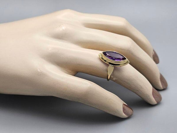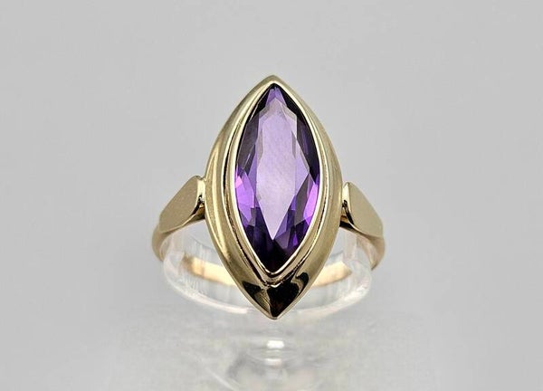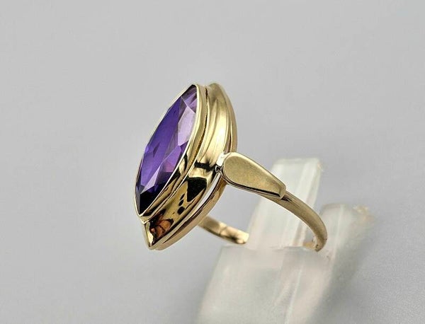 Deze 14 karaat gouden vintage dames ring. De sierlijke vorm geeft deze ring de op en top vintage uitstraling. Maar het mooiste van alles is toch wel de edelsteen. Dit is een paarse saffier die een bijzondere mooie kleur en vorm heeft.