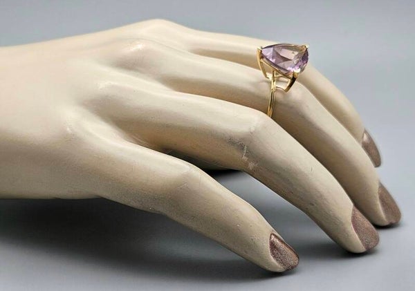 Deze gouden vintage blikvanger dames ring is gemaakt van 9 karaat. De ring is gezet met een facet geslepen edelsteen ametrien.