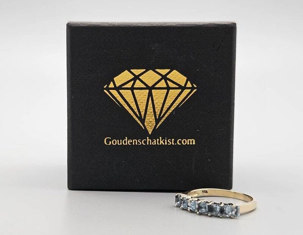 Deze gouden vintage dames ring is gemaakt van 9 karaat geelgoud. De ring is gezet met een facet geslepen edelsteen saffier.
