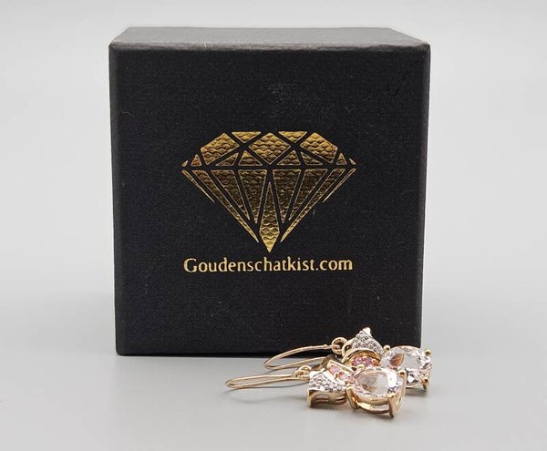 Deze vintage gouden oorbellen zijn een toevoeging aan jouw collectie. Ze zijn gemaakt van 9 karaat geel goud. De saffier en morganiet zijn briljant en facet geslepen, de diamanten zijn briljant geslepen zodat ze prachtig opvallen.