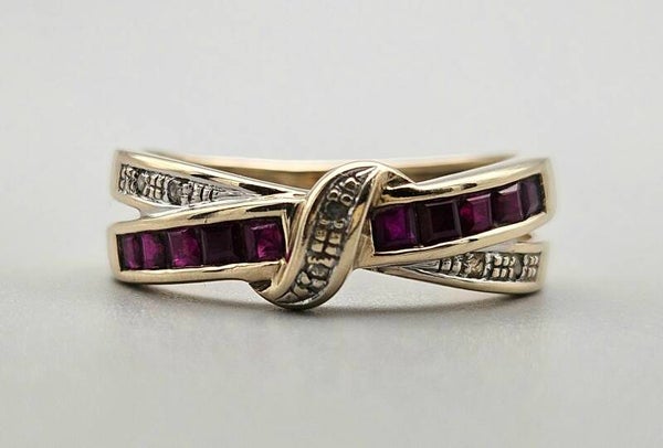 Deze prachtige mooie vintage ring is gemaakt van 9 karaat. De ring is gezet met diamanten en prachtige edelstenen robijn. De robijnen zijn facet geslepen en vallen mooi op. De diamanten zijn briljant geslepen.