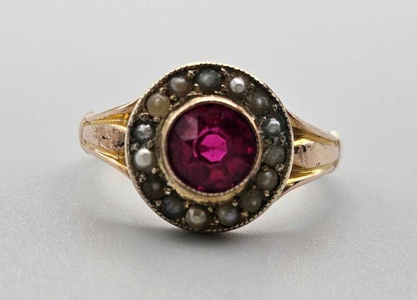 Vintage ring met edelstenen robijn en parels. 2024/495.