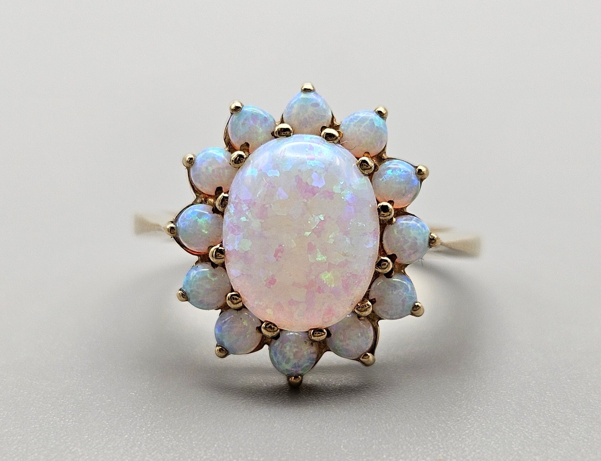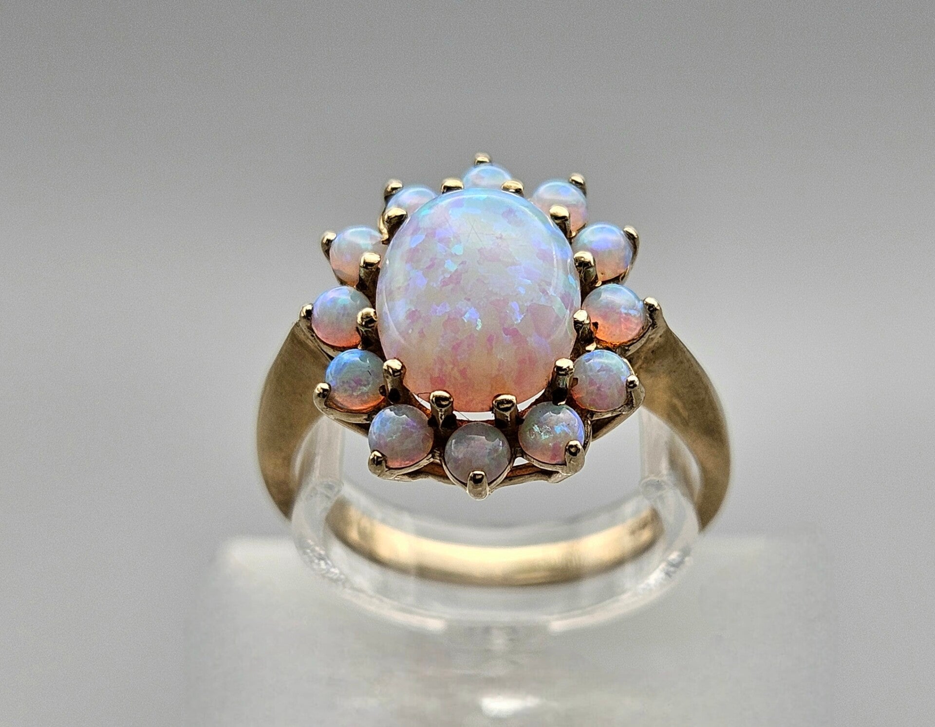Deze prachtige blikvanger vintage ring is gemaakt van 9 karaat. De ring is gezet met een prachtige edelstenen opaal. De opalen zijn cabochon geslepen. De opalen zijn vermoedelijk gekweekte opaal.