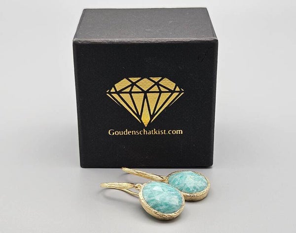 Dit setje oorbellen is met edelstenen ingezet, wat voor een mooie klassieke touch zorgt. De steenkleur is groene kleur amazoniet. Zo zijn deze oorbellen prachtig te mixen en matchen met kleurrijke sieraden, maar ook perfect om een neutrale set die laatste draai te geven.