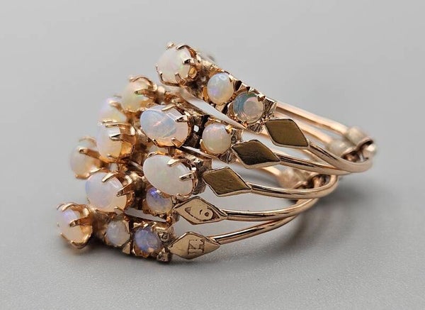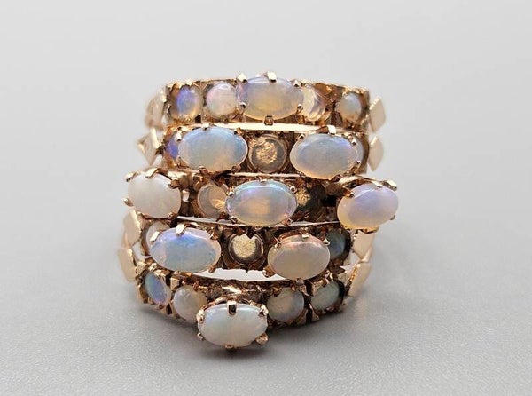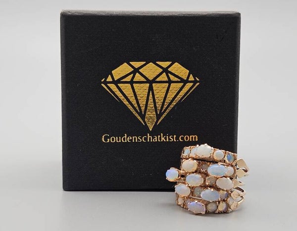 Deze prachtige vintage dames ring is gemaakt van 9 karaat. De ring is gezet met een cabochon geslepen edelstenen opalen. Dit is echt een eye-catcher. Zit meer kleur in dan op de foto's te zien.