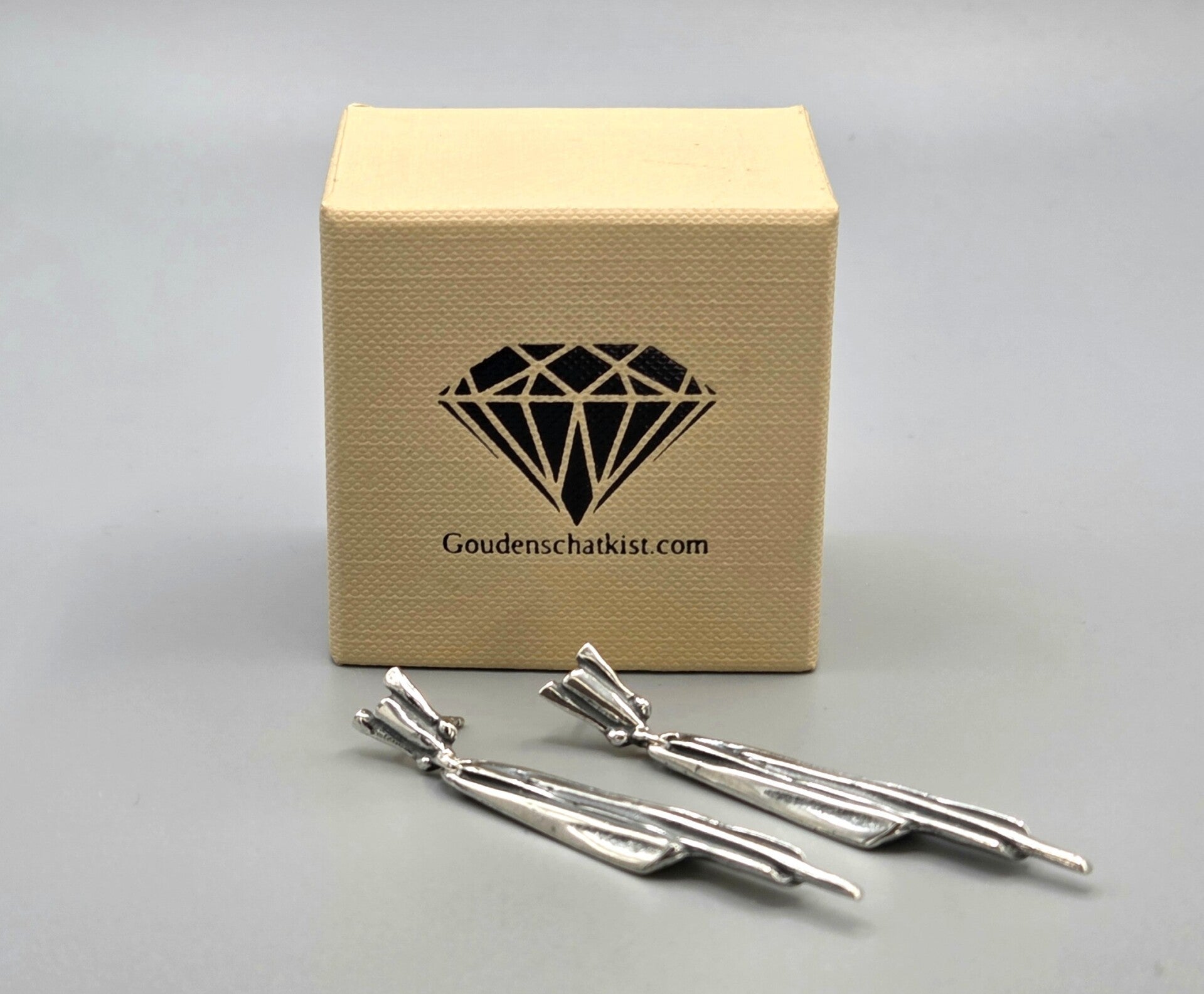 Een kunstwerk in je oren deze zilveren modernistische oorbellen ontworpen door de bekende beeldend kunstenaar Harrie Lenferink. Stevige 1e gehalte zilveren oorbellen.
