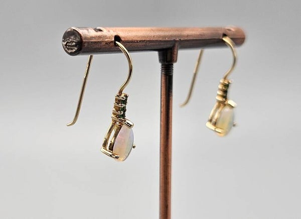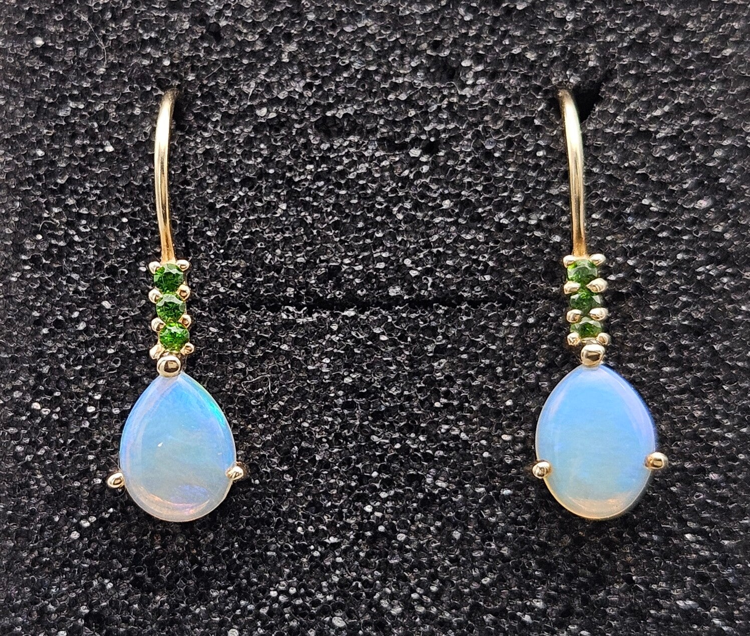 Deze prachtige vintage oorbellen zijn een toevoeging aan jouw collectie. Ze zijn gemaakt van 9 karaat. De edelsteen opaal is cabochon geslepen, de edelstenen groene saffier zijn briljant geslepen zodat ze prachtig kunnen schitteren.