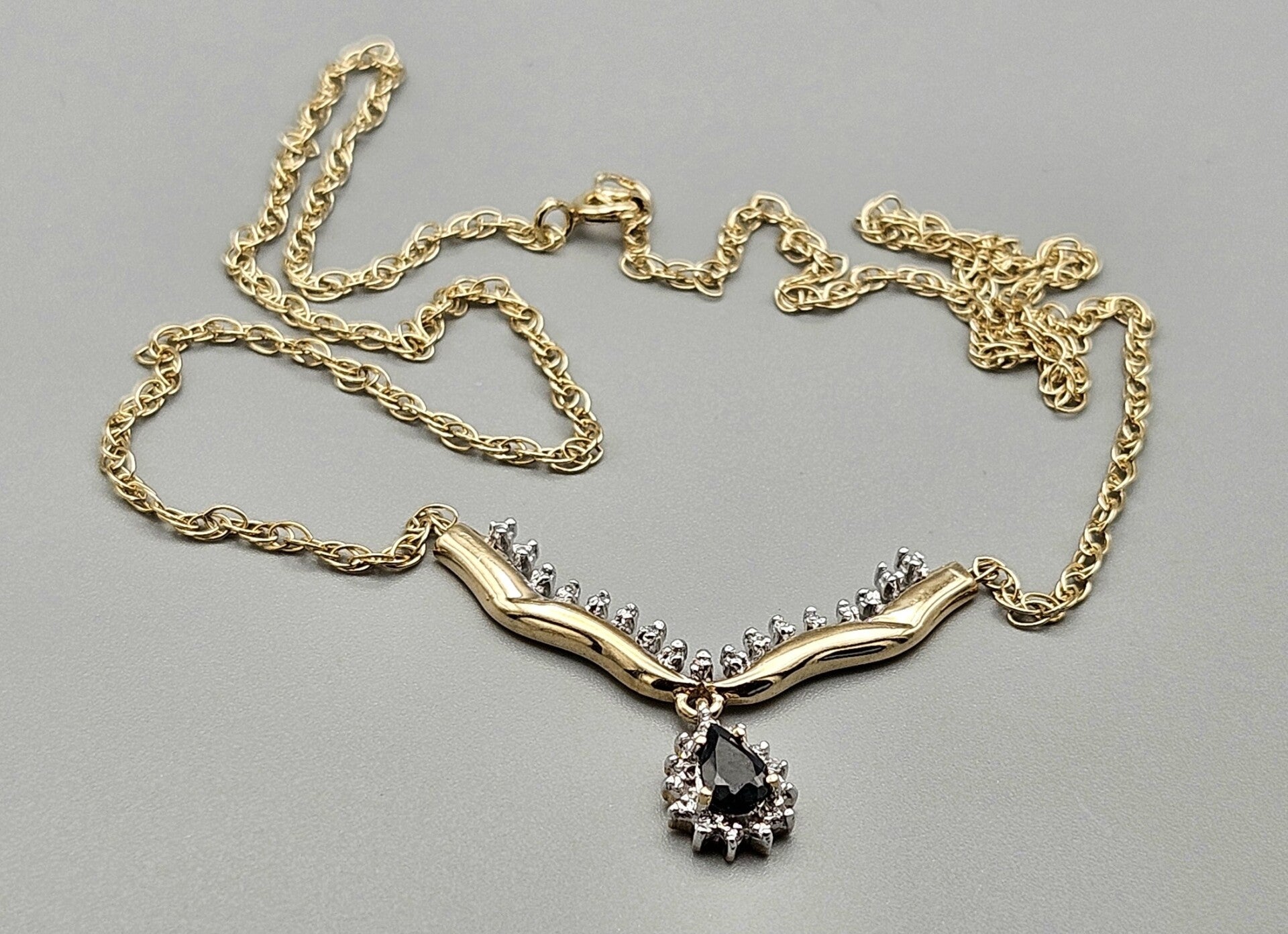 Deze dames ketting is gemaakt van 9 karaat en heeft een vaste hanger. De hanger is gezet met peer geslepen saffieren en 28x briljant geslepen diamanten. De diamanten hebben samen een gewicht van 0.28 ct.