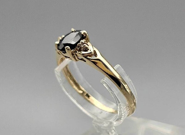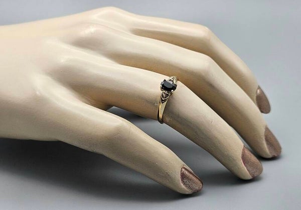 Deze prachtige vintage ring is gemaakt van 9 karaat. De ring is gezet met diamanten en prachtige zwarte edelsteen saffier. De saffier is facet geslepen. De diamanten zijn briljant geslepen.