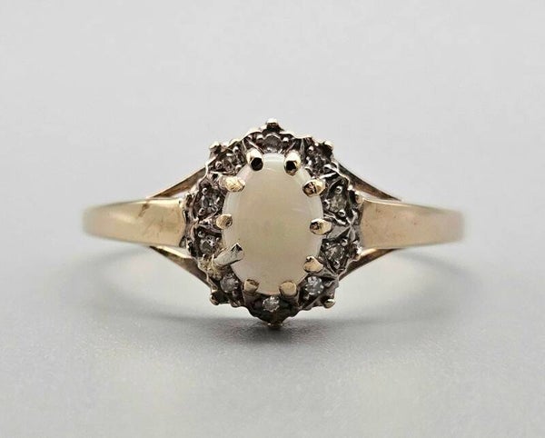 Deze prachtige vintage gouden ring is gemaakt van 9 karaat. De ring is gezet met diamanten en prachtige edelsteen opaal. De opaal is cabochon geslepen. De diamanten zijn briljant geslepen.