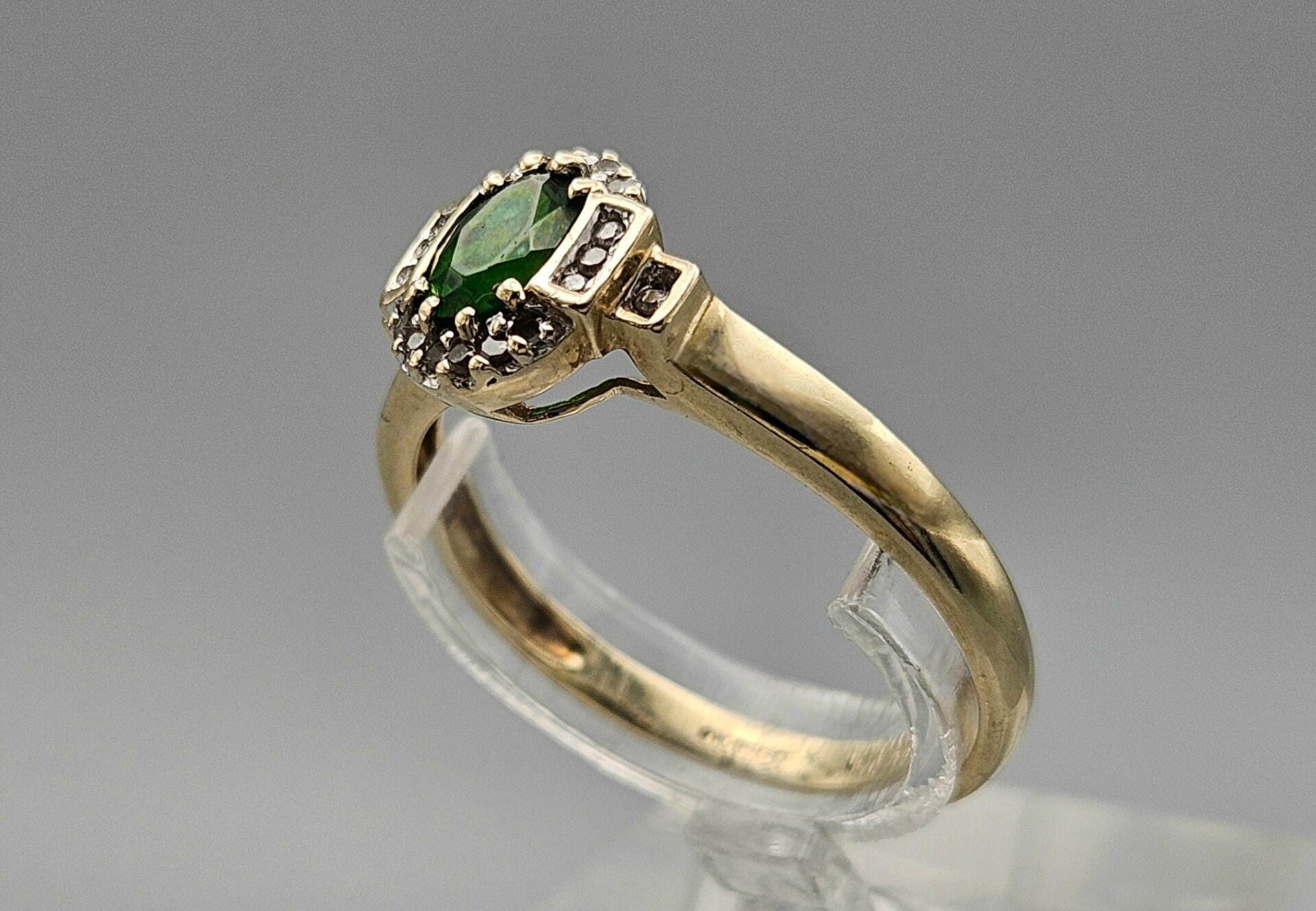 Droom weg met deze prachtige vintage ring! De schoonheid van deze ring is moeilijk onder woorden te brengen. Hij is gemaakt van 9 karaat en is gezet met diamanten en een edelsteen smaragd.