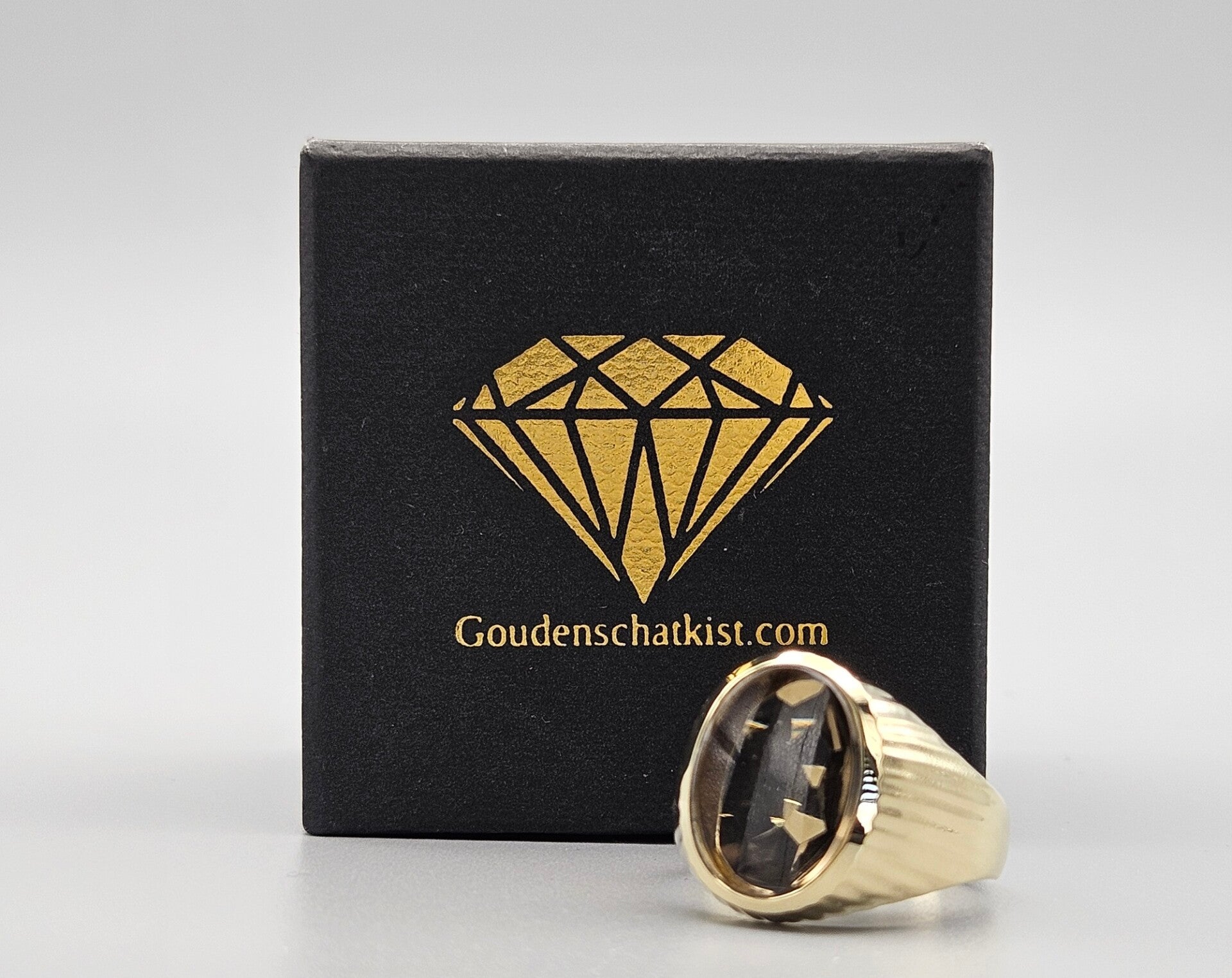 Deze klassieke en stijlvolle mannen ring is gemaakt van 14 karaat geelgoud en voorzien van een opvallende edelsteen rooktopaas.
