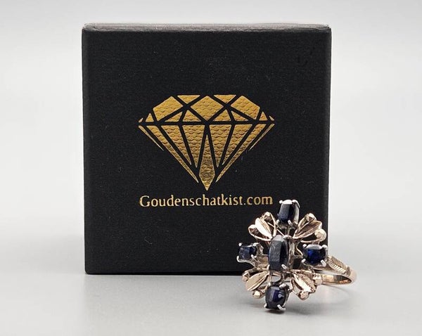 Ben je op zoek naar een uniek sieraad dat de aandacht trekt? Dan is deze 14 karaat gouden ring een perfecte keuze. Het pronkstuk van deze ring zijn de facet geslepen edelstenen saffier, die met zijn mooie blauwe kleur en schitterende facetten onmiddellijk in het oog springt.
