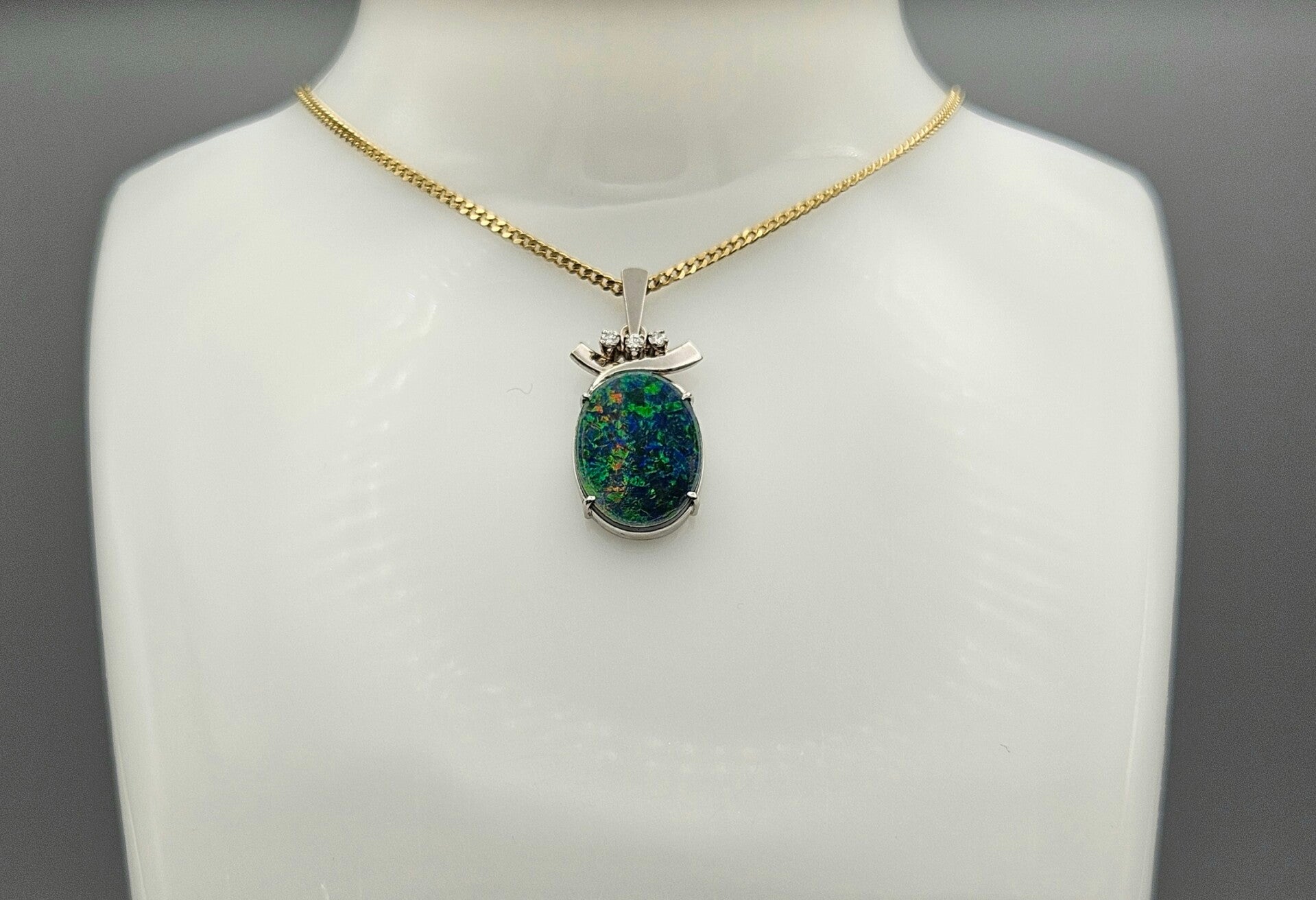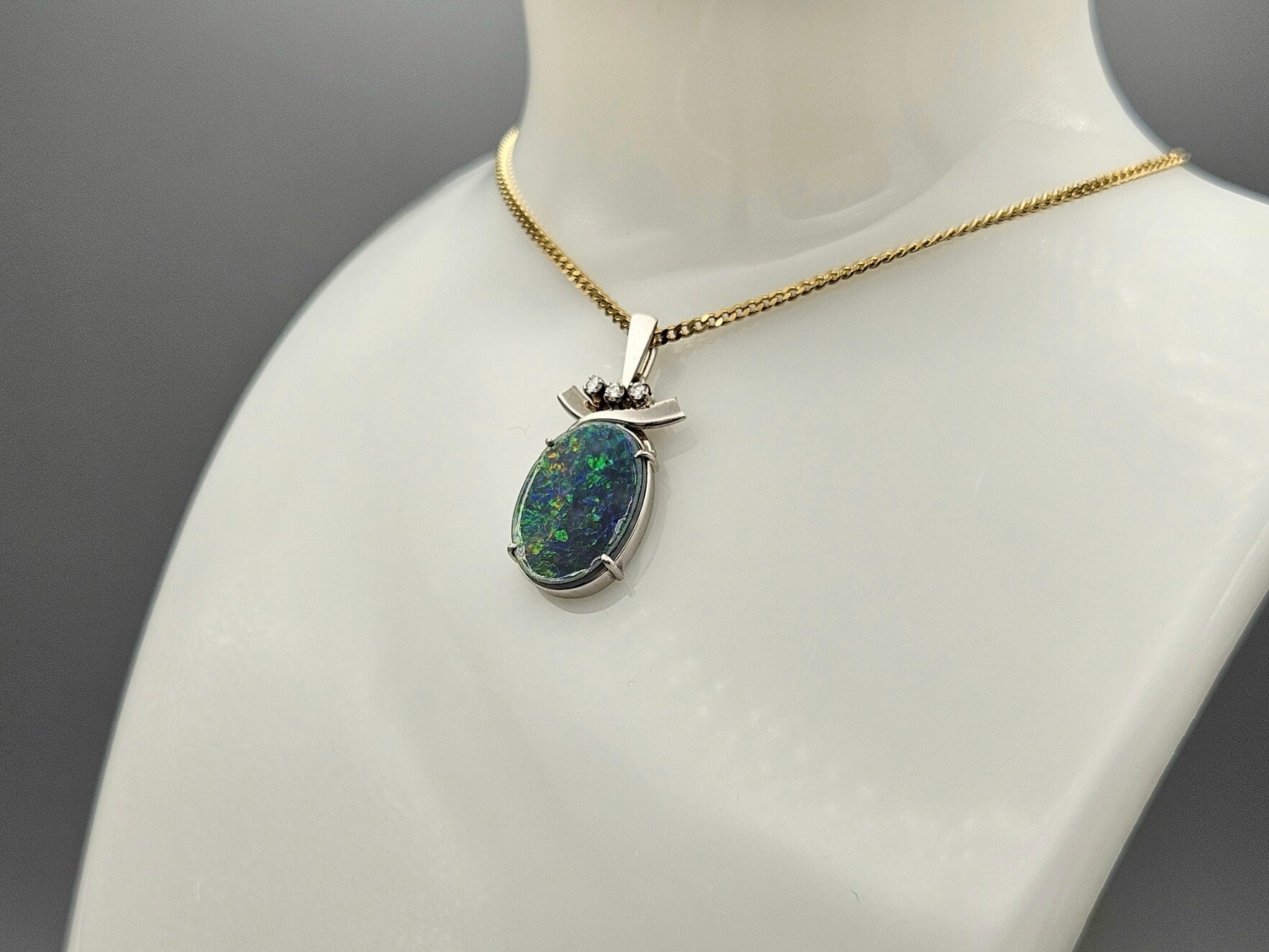 Een prachtige opvallende verschijning! Bij deze hanger komt alles perfect samen. De gouden hanger is gemaakt van 14 karaat wit goud en heeft die bijzonder mooie uitstraling, wat zo kenmerkend is van vintage gouden hangers. De opaal edelsteen is er eentje om bij weg te dromen, want de kleuren zijn zó mooi. De diamanten zijn briljant geslepen. Zie ons filmpje op instagram. In het echt veel mooier.