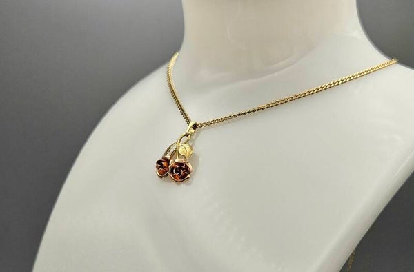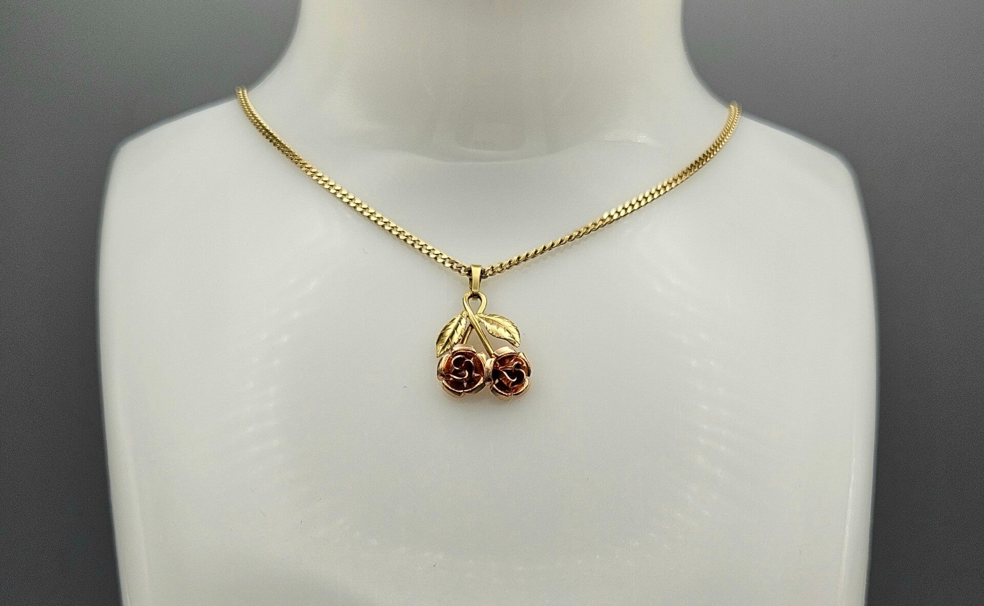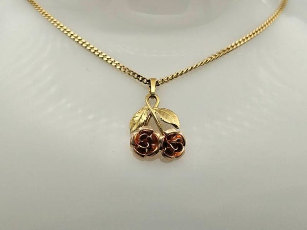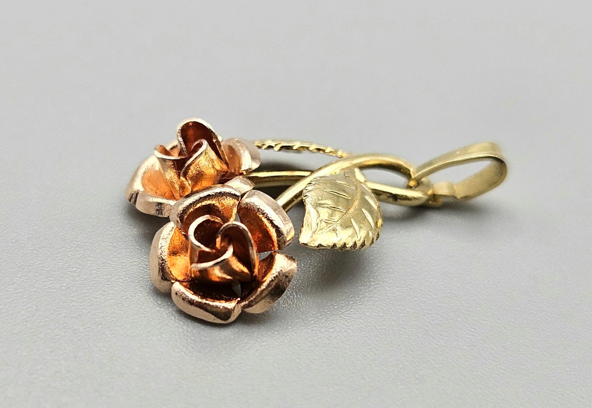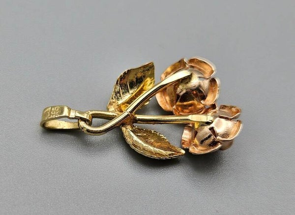 In zeer goede staat, handvervaardigd 14 karaat gouden Theodor Klotz design ketting hanger met rosé gouden rozen en geelgouden gravé bladeren.