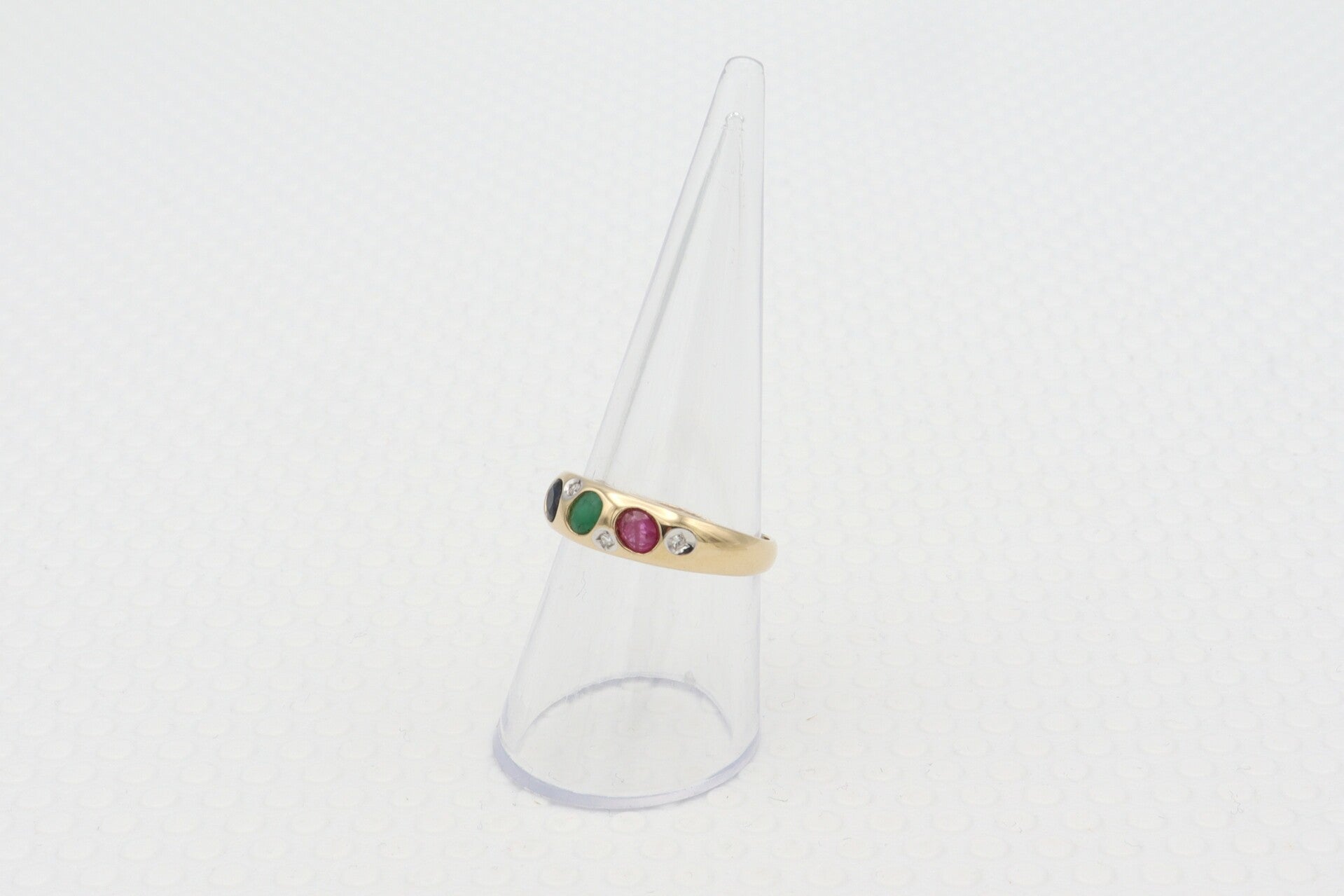 14 Karaat. Gouden vintage ring met robijn,saffier,smaragd en diamant. Maat: 18.2. Nr: 2020/539.