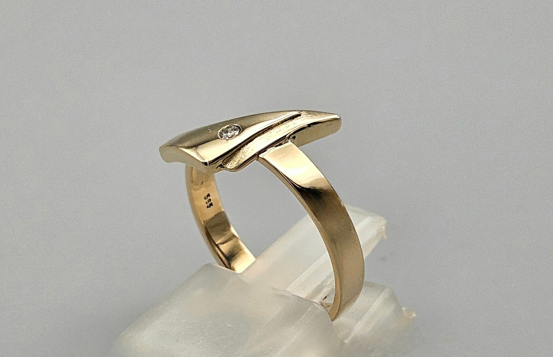 Een absolute vintage gouden ring! Deze vintage gouden ring met diamant is bijzonder door zijn vorm en de diamant, die een gewicht van 0.03 ct heeft. De ring is gemaakt van 14 karaat goud. In het echt is de diamant heel mooi.