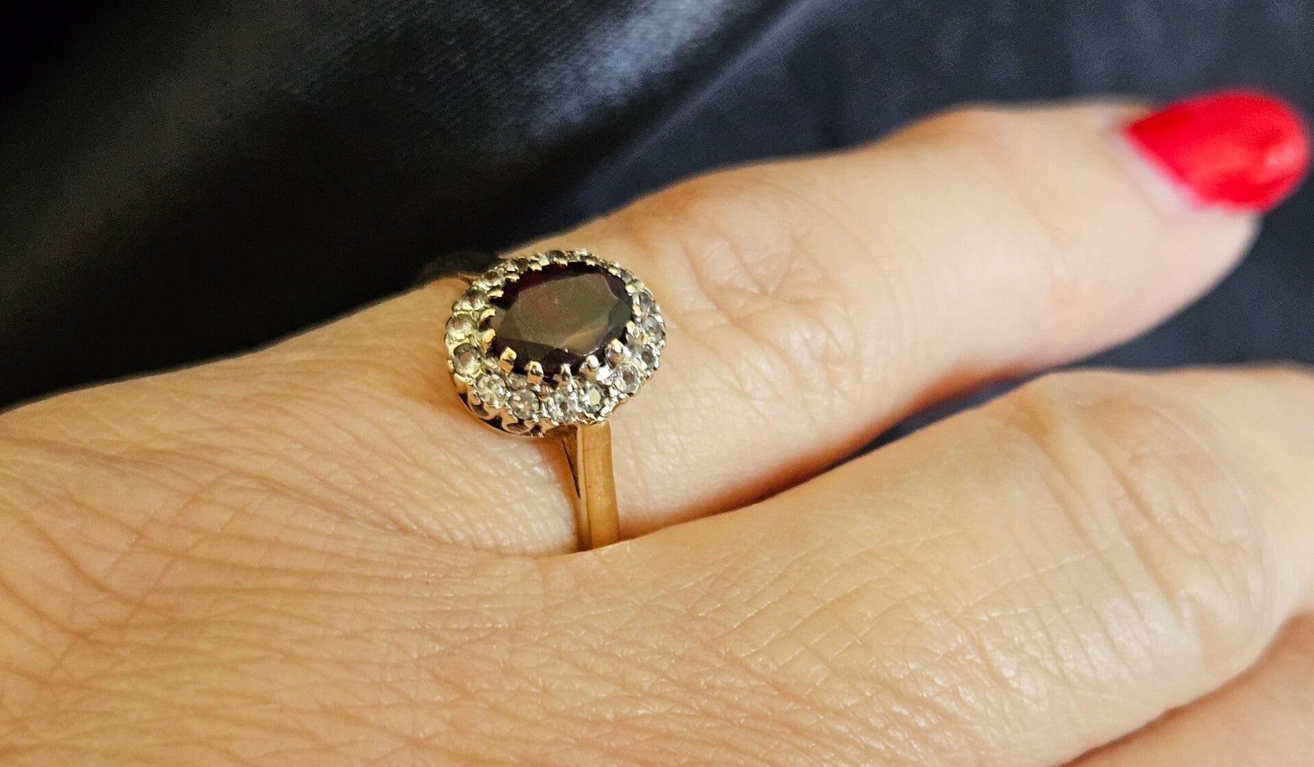 Vintage ring met edelsteen granaat en zirkonia. 2025/174