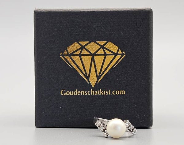 Deze wit gouden parel ring is gemaakt van 14 karaat goud.Door het gekruiste model, is de ring optisch breder. De ring is gezet met briljant geslepen diamanten en een parel. De diamanten hebben een gewicht van 0.14 ct.