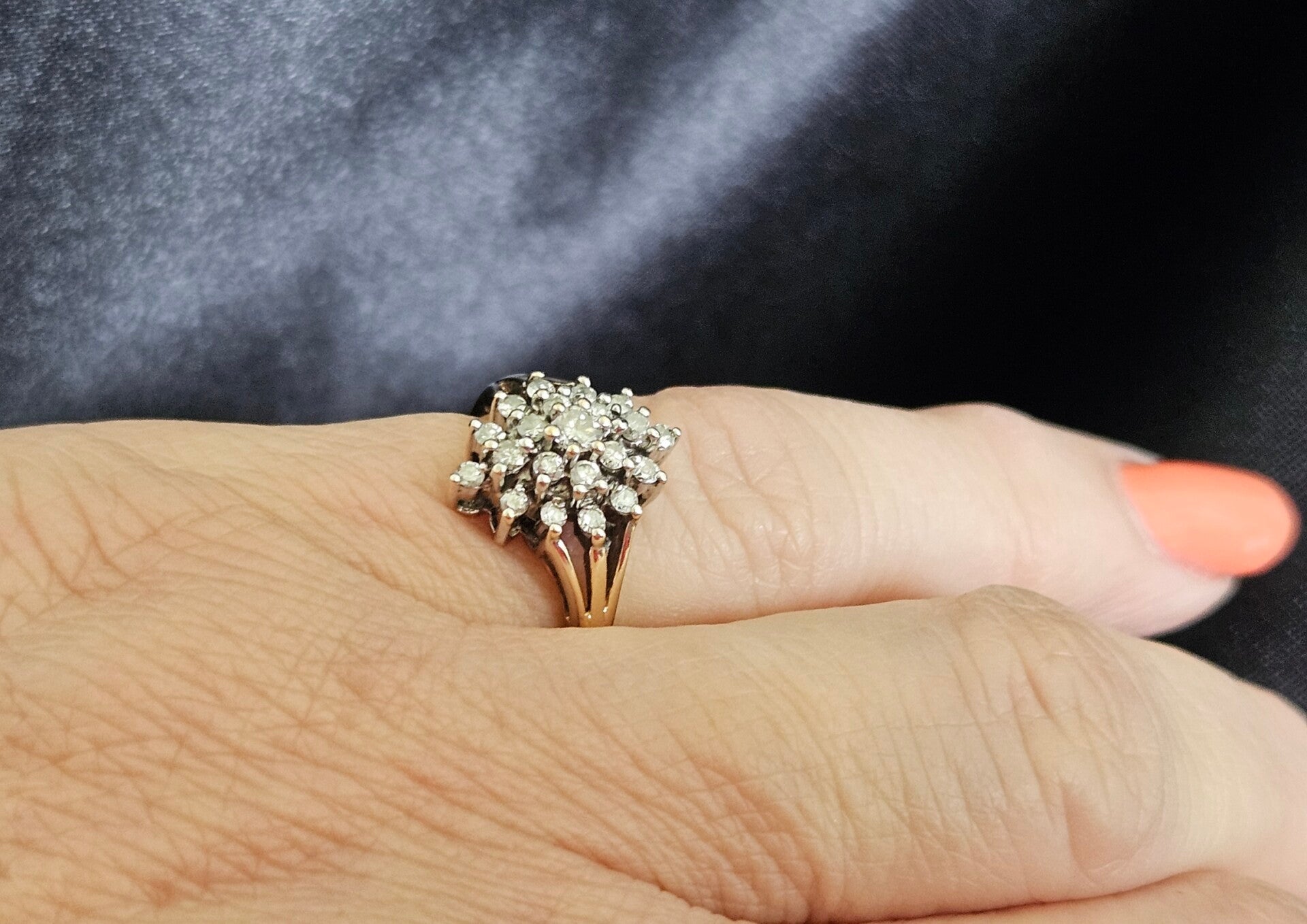 Met maar liefst 21 diamanten en een uniek ontwerp, is dit een prachtige vintage ring met heel groot WOW effect. Hij is gemaakt van 9 karaat en heeft een prachtige zetting die op een bloem met waaiereffect lijkt. De diamanten zijn briljant geslepen en hebben een gewicht van 0.33 ct.