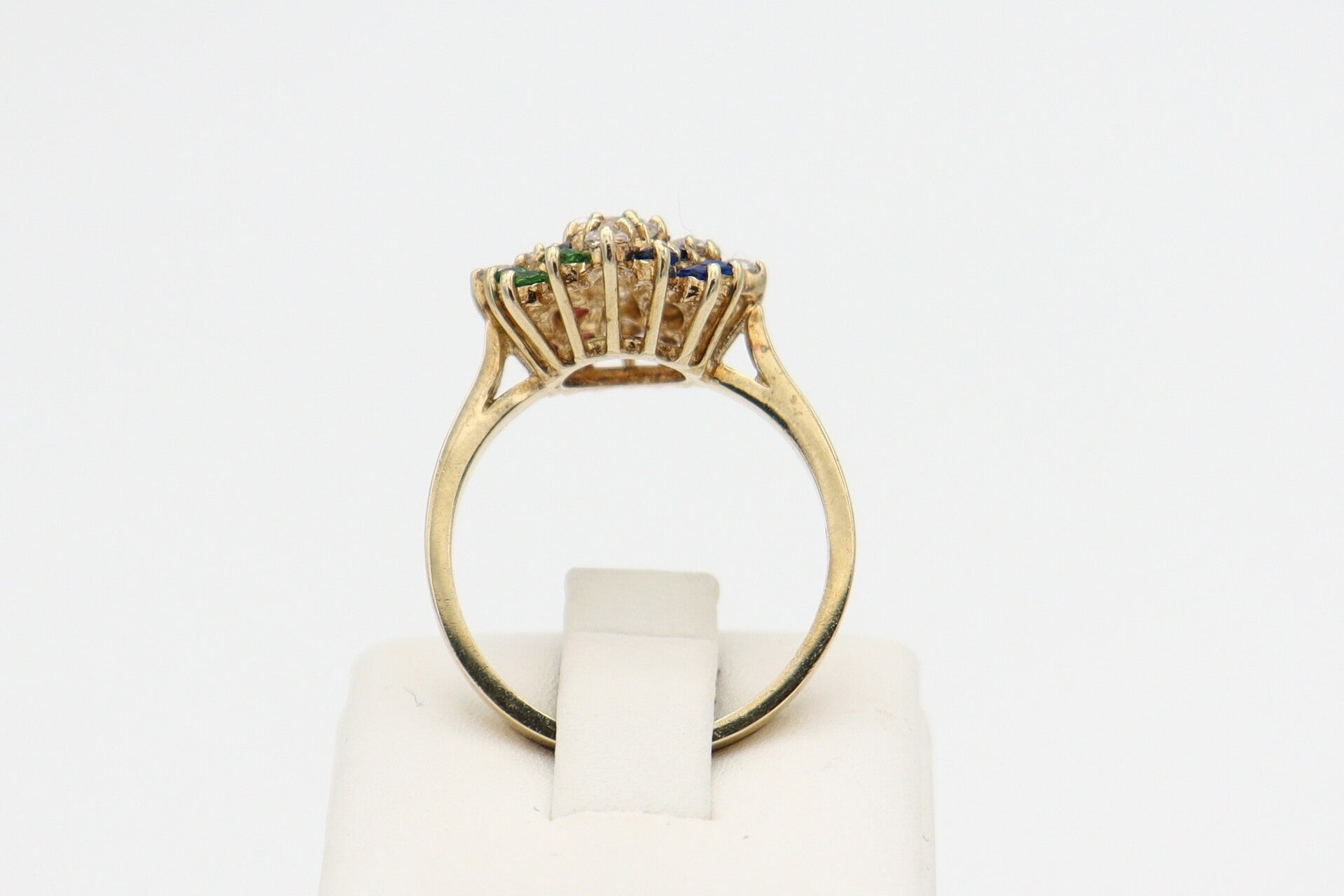 9 Karaat. Vintage ring met robijn,smaragd,saffier,amethist en witte saffier. Maat: 17. Nr: 2020/566.