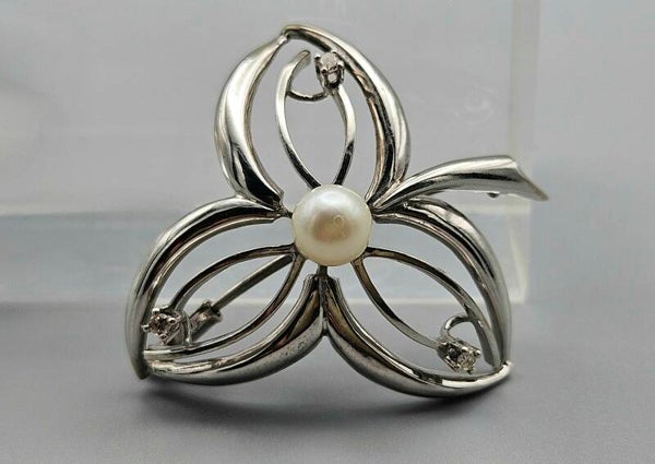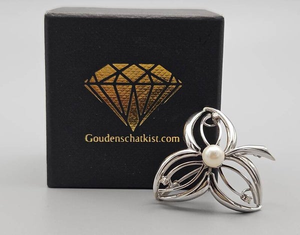 Wit gouden vintage broche met parel en diamant: 2025/298.