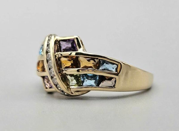 Deze vintage dames ring is gemaakt van 9 karaat. Het is een echte opvallende vintage ring. Dat komt natuurlijk door die schitterende amethist, peridot, topaas en citrien. Daarnaast zitten er ook nog brilant geslepen diamanten in.