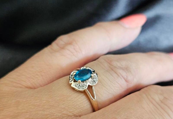 Deze prachtige vintage ring is gemaakt van 10 karaat. De ring is gezet met diamanten en prachtige blauwe edelsteen topaas. De topaas is facet geslepen. De diamanten zijn briljant geslepen.