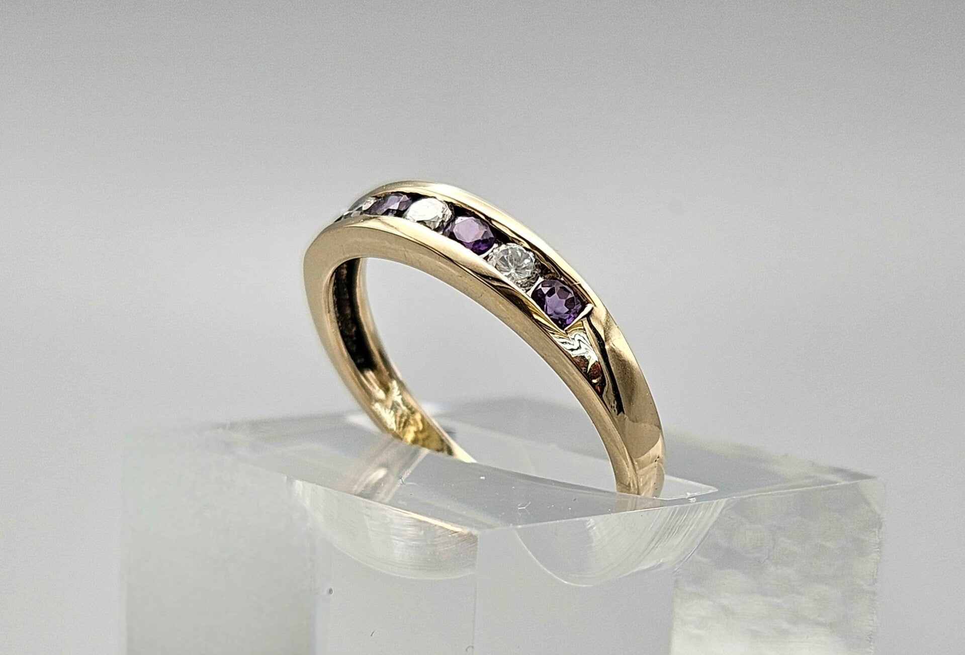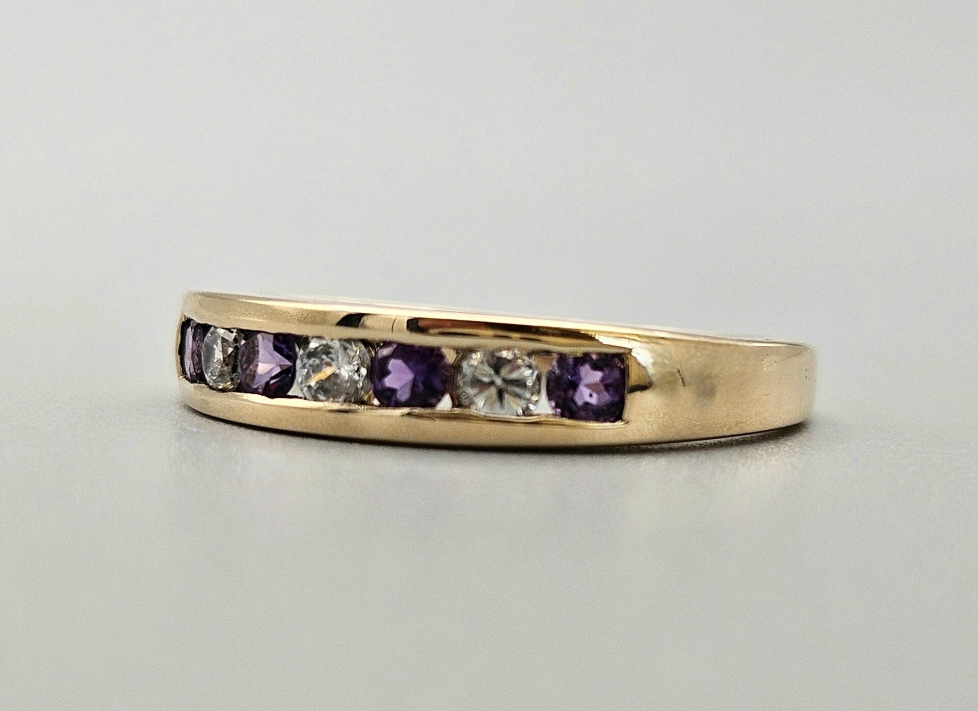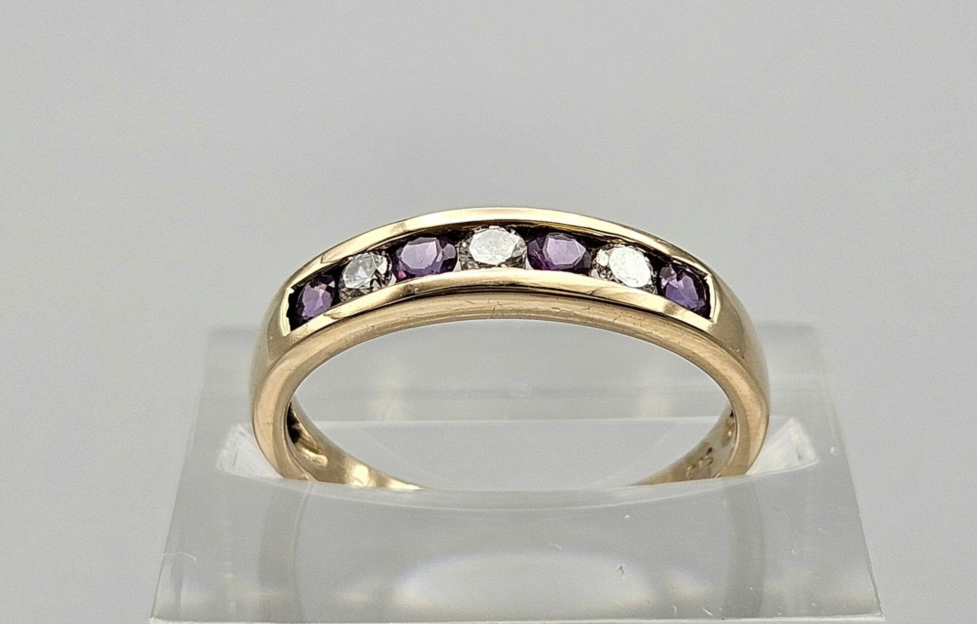 Deze prachtige vintage design ring is gemaakt van 9 karaat. De ring is gezet met zirkonia en prachtige paarse edelsteen toermalijn. De toermalijn is briljant geslepen. De zirkonia's zijn briljant geslepen.