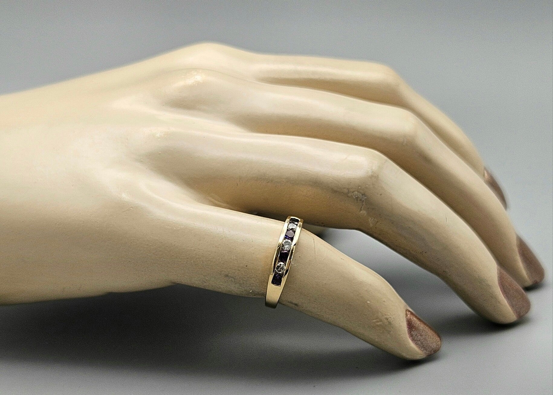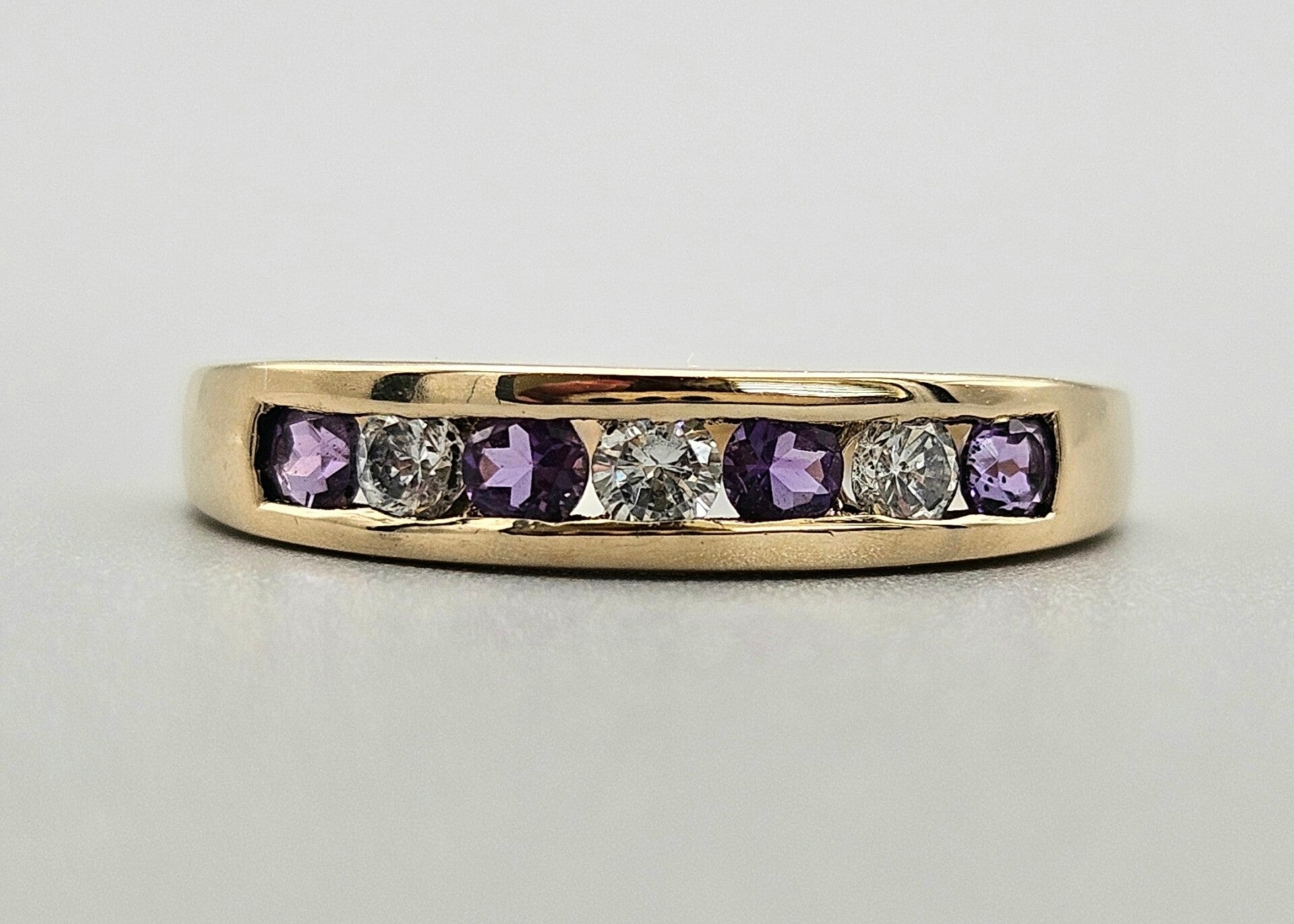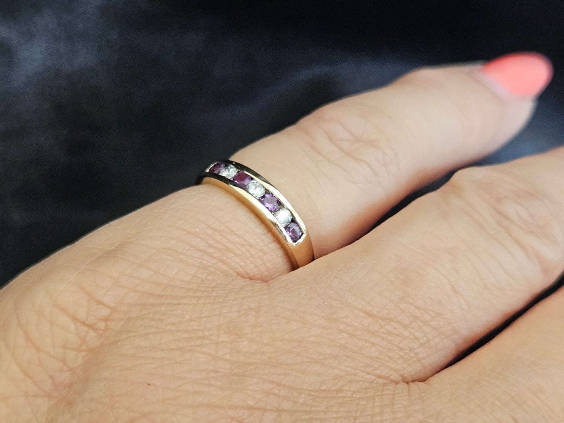 Deze prachtige vintage design ring is gemaakt van 9 karaat. De ring is gezet met zirkonia en prachtige paarse edelsteen toermalijn. De toermalijn is briljant geslepen. De zirkonia's zijn briljant geslepen.