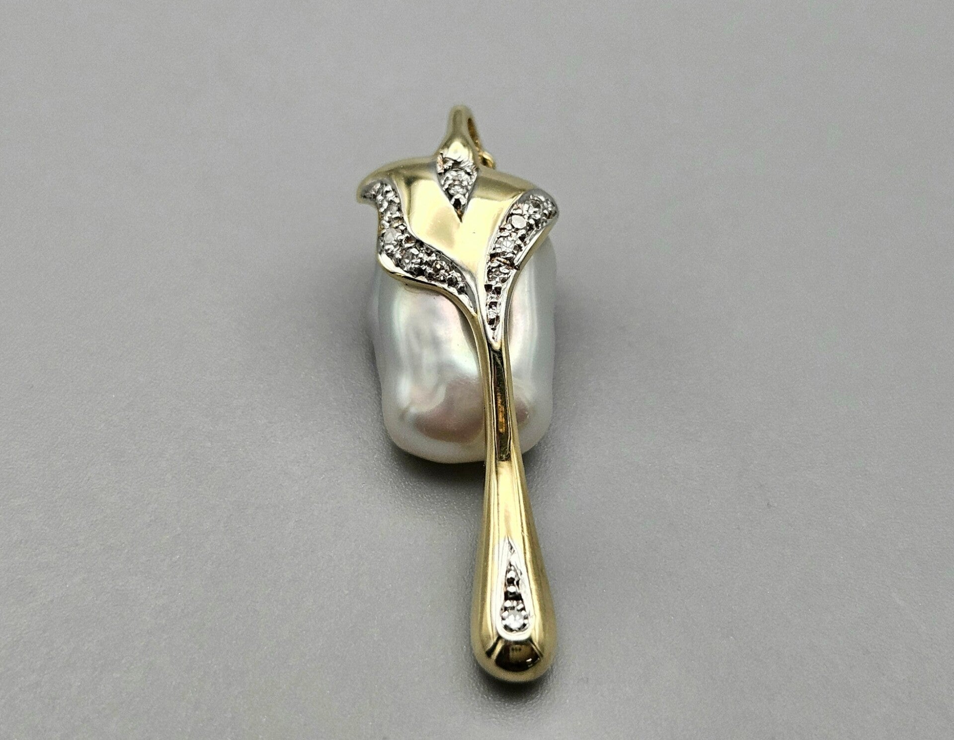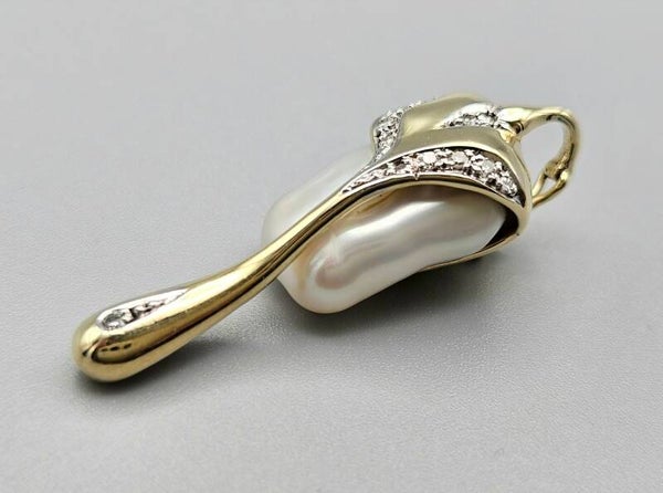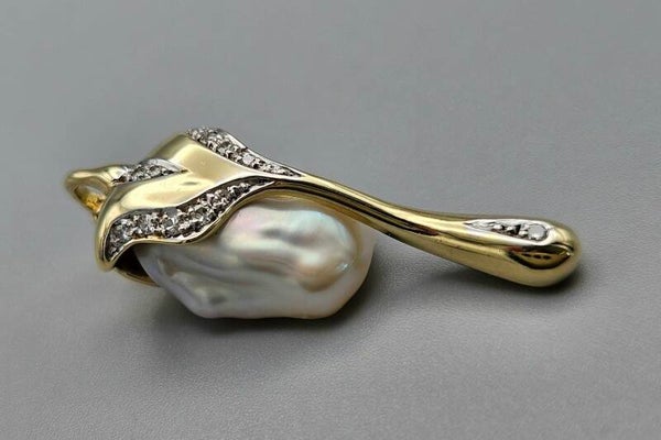 Vintage gouden kliphanger met barok parel en diamanten. 2025/399.