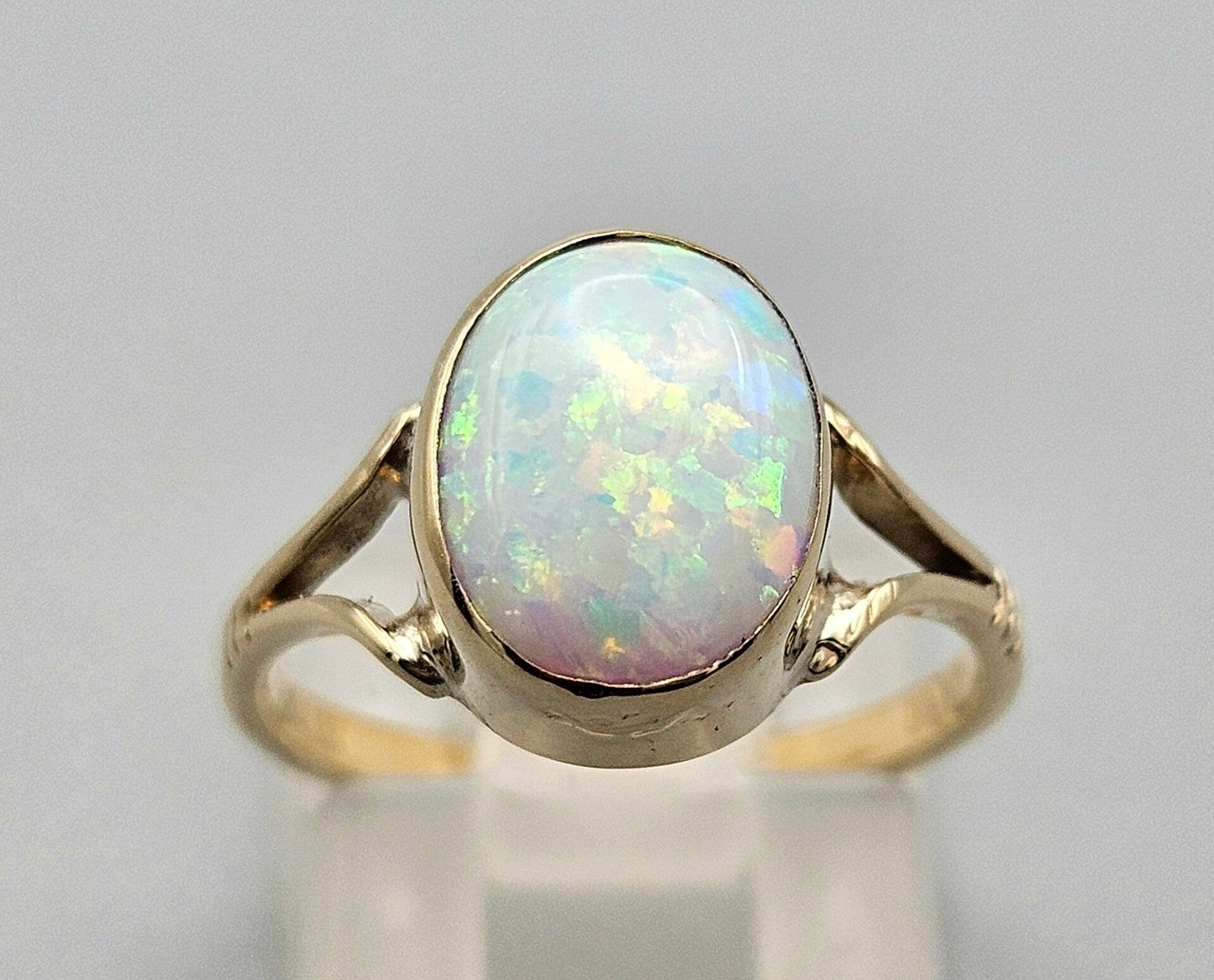 Deze vintage ring is een echte statement ring. Hij is gemaakt van 9 karaat, met in het middelpunt een prachtige edelsteen opaal die alle aandacht trekt. De verfijnde zetting omarmt de edelsteen opaal met verfijning en voegt een vintage charme toe aan het geheel.