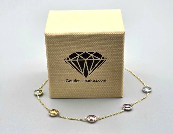 Een prachtige vintage ketting voor het leven! Want deze prachtige collier is tijdloos, elegant, vrouwelijk en super chique. De ketting is gemaakt van 9 karaat en gezet met topaas, peridot, amethist, citrien en toermalijn edelstenen.