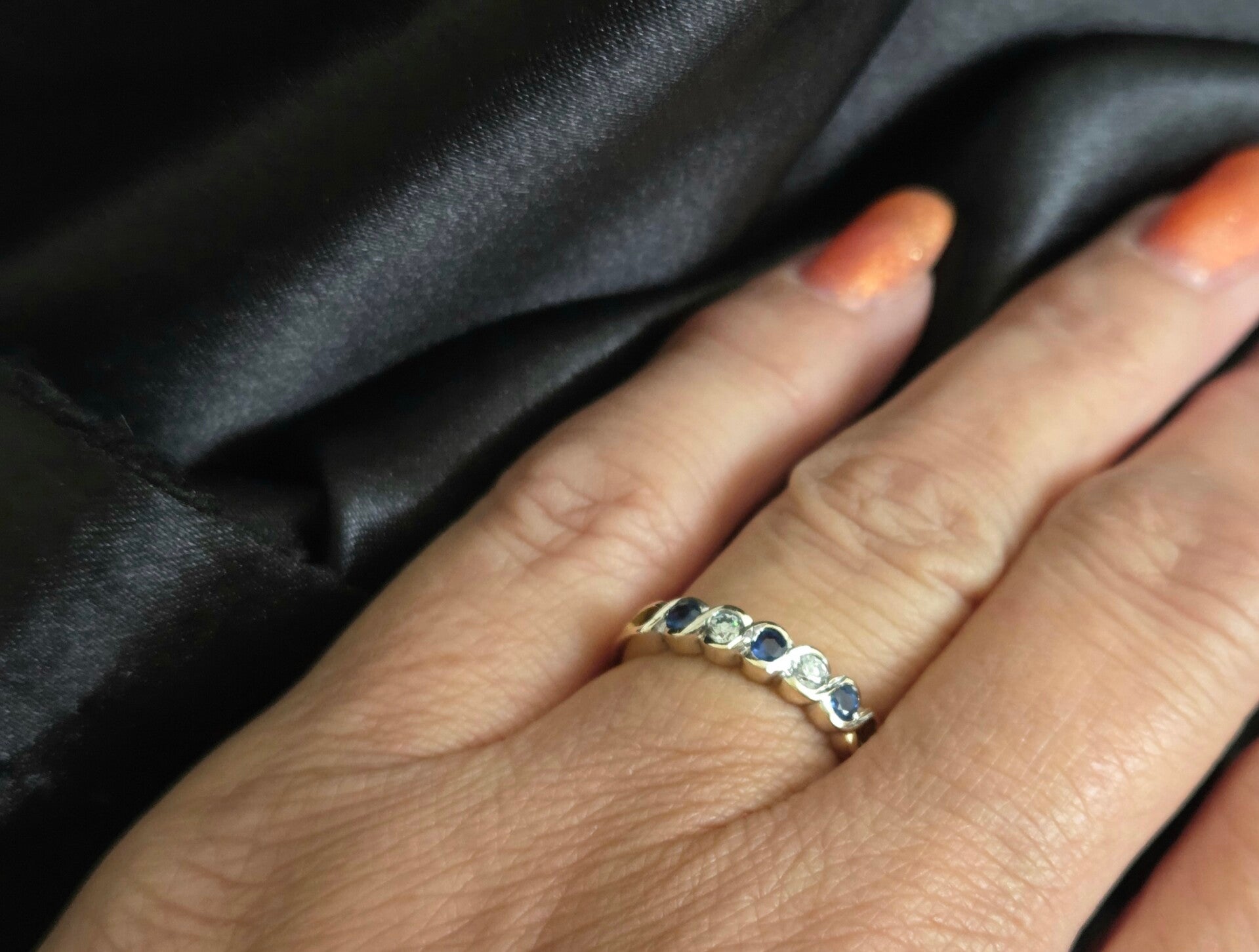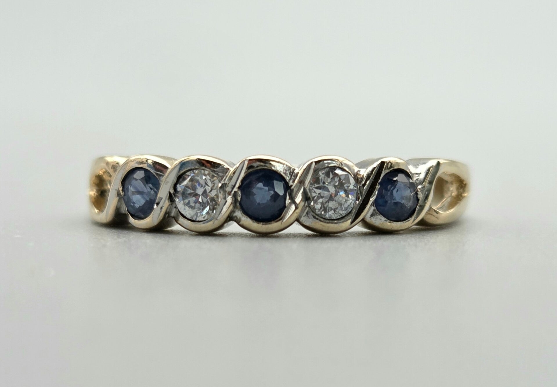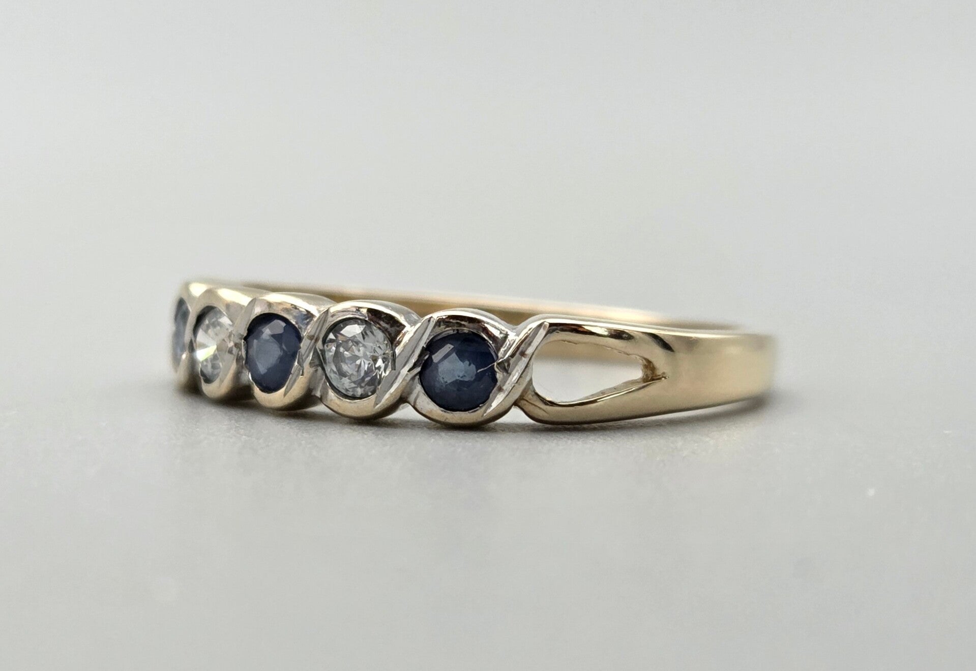 Deze prachtige vintage ring is gemaakt van 9 karaat. De ring is gezet met witte topaas en prachtige blauwe edelsteen saffier. De topaas is briljant geslepen. De saffieren zijn briljant geslepen.