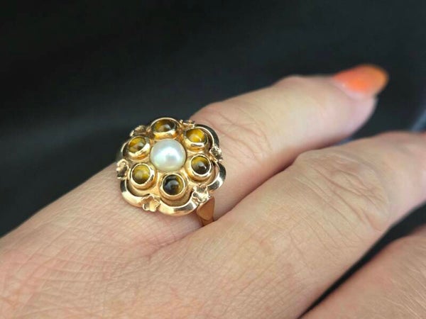Gouden antieke ring met edelsteen tijgeroog en parel. 2025/524.