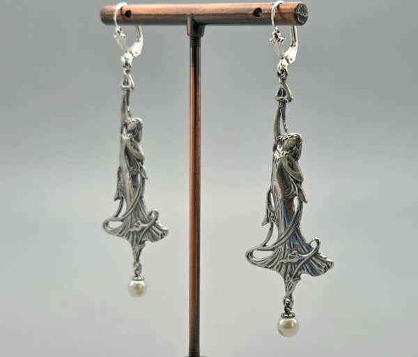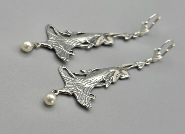 Deze zilveren Art Deco/ Art Nouveau oorbellen zijn letterlijk ” schitterend ”. Deze stijlvolle oorhangers schitteren aan je oren!! Ze zijn gemaakt van 925 zilver en gezet met parel. Door hun bijzondere vorm en de mooie kleur vallen ze prachtig op.